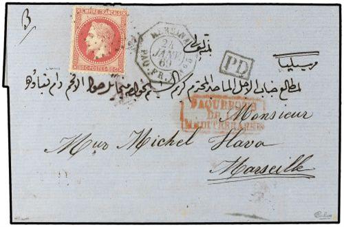 1869 Cover to MARSEILLE franked by 1868 perf Empire 80 c. carmine rose tied by Anchor lozenge with, alongside, octagonal MERSINA-PAQ FR.X Nº5 in black, Salles 909, red PAQUEBOTS DE LA MEDITERRANEE and arrival on reverse. Scarce and pretty cover. Sc 36.