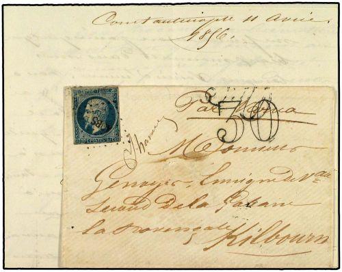 1856 (Apr 11) Cover with original contents written from CONSTANTINOPLE and endorsed ´Par Varna´ with previously used imperf Empire 1853 20 c. cancelled by AOBS dotted lozenge and thus taxed ´30´ addressed to Ensing in the French Army in the Crimea with rare arrival ARMEE D´ORIENT (Apr 13) cds in black on reverse of rare cover.