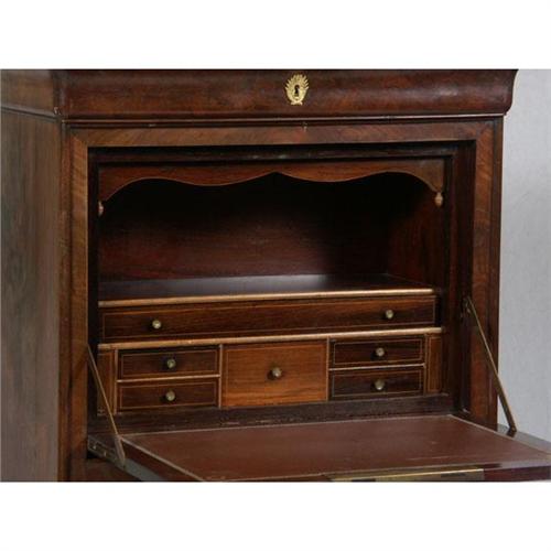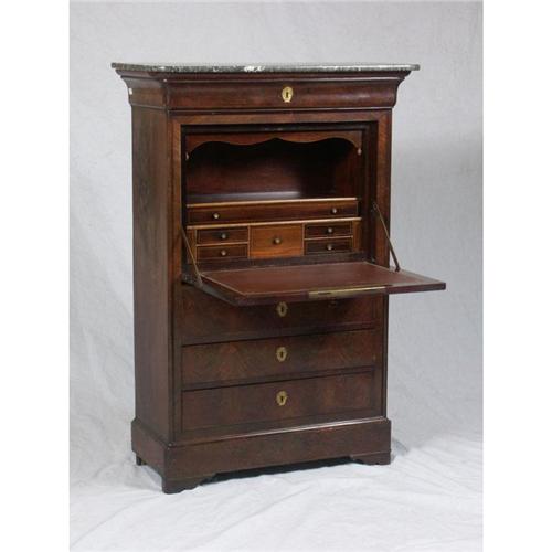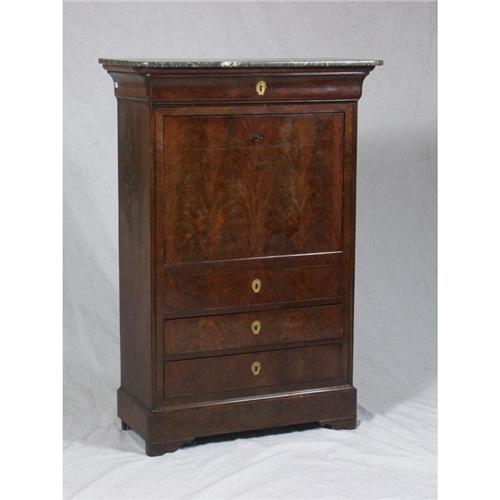 SECRETAIRE A ABATTANT: French Louis Philippe circa 1830-48 Secretaire A Abattant, flame grain mahogany veneers, fall front encloses string inlayed drawers and gilt tooled leather writing surface, grey marble top, ormolu escutcheons. Note: fall front with age crack and some discoloration. 56''h x 18''d x 38''w