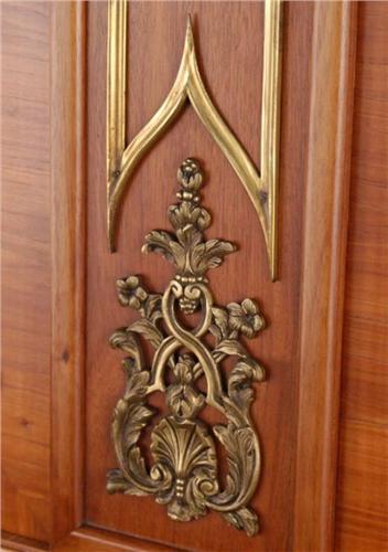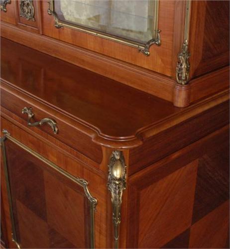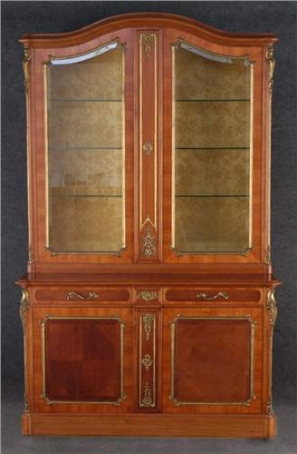 FRENCH LOUIS XV STYLE DISPLAY CABINET with arched top and gilt mounts, parquetry door panels and sides, beveled glass doors, now fitted with lights, circa 1920, 93" high, 58" wide, 26" deep, condition: excellent, small holes in back of bottom cabinet and