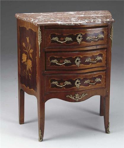 FRENCH LOUIS XV STYLE MARBLE TOP COMMODE. Small size three-drawer commode has serpentine front, red marble top and nice flower inlay to sides and drawer fronts. Ormolu mounts with good decorative hardware. SIZE: 32” h x 26-3/4” w x 17-1/2” d. CONDITION: Very good. 9-27949