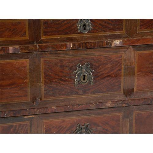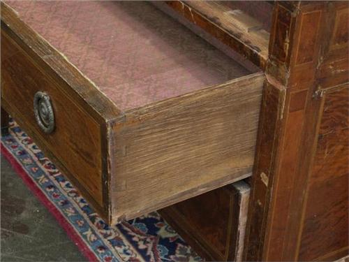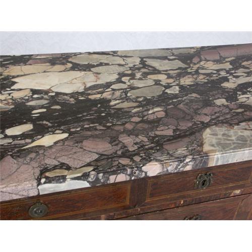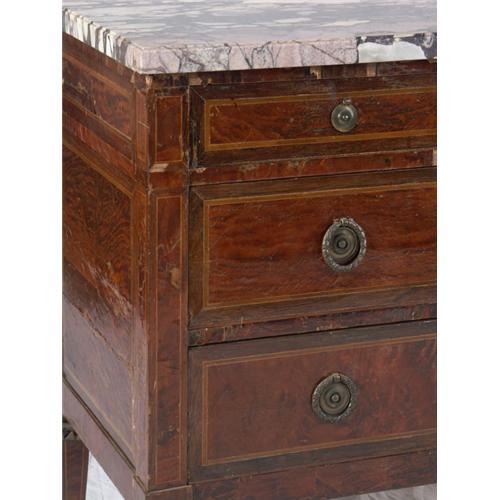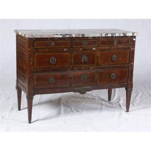 COMMODE: French Louis XVI circa 1795 commode, marble top, crossbanded and string inlay, overall fair condition with veneer losses. 36''h x 20''d x 49''w