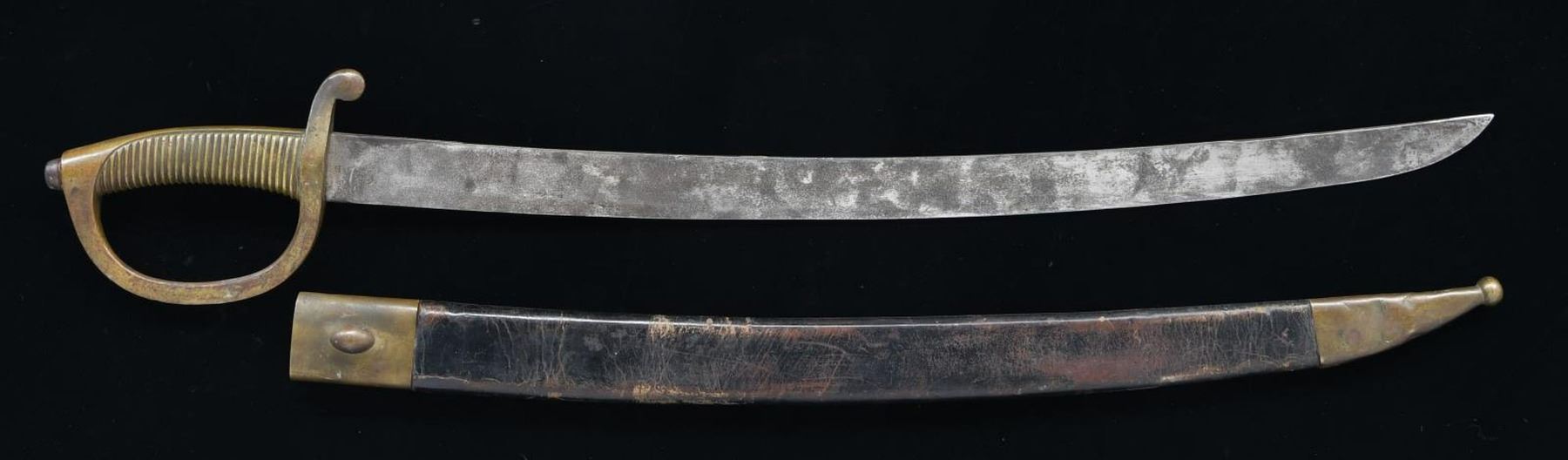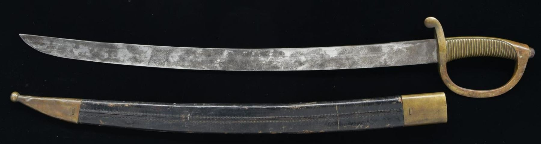 Overall length: 29 1/2". Blade length: 23 1/4". Plain, flat blade stamped on the ricasso “CA”. Solid brass hilt with ribbed grip. Brass mounted leather scabbard. CONDITION: blade has a medium gray mottled patina. Hilt has a mellow mustard patina, as do the mounts on the scabbard. Scabbard body is a little flexed but remains very solid. (02-20161/BF). $150-250.