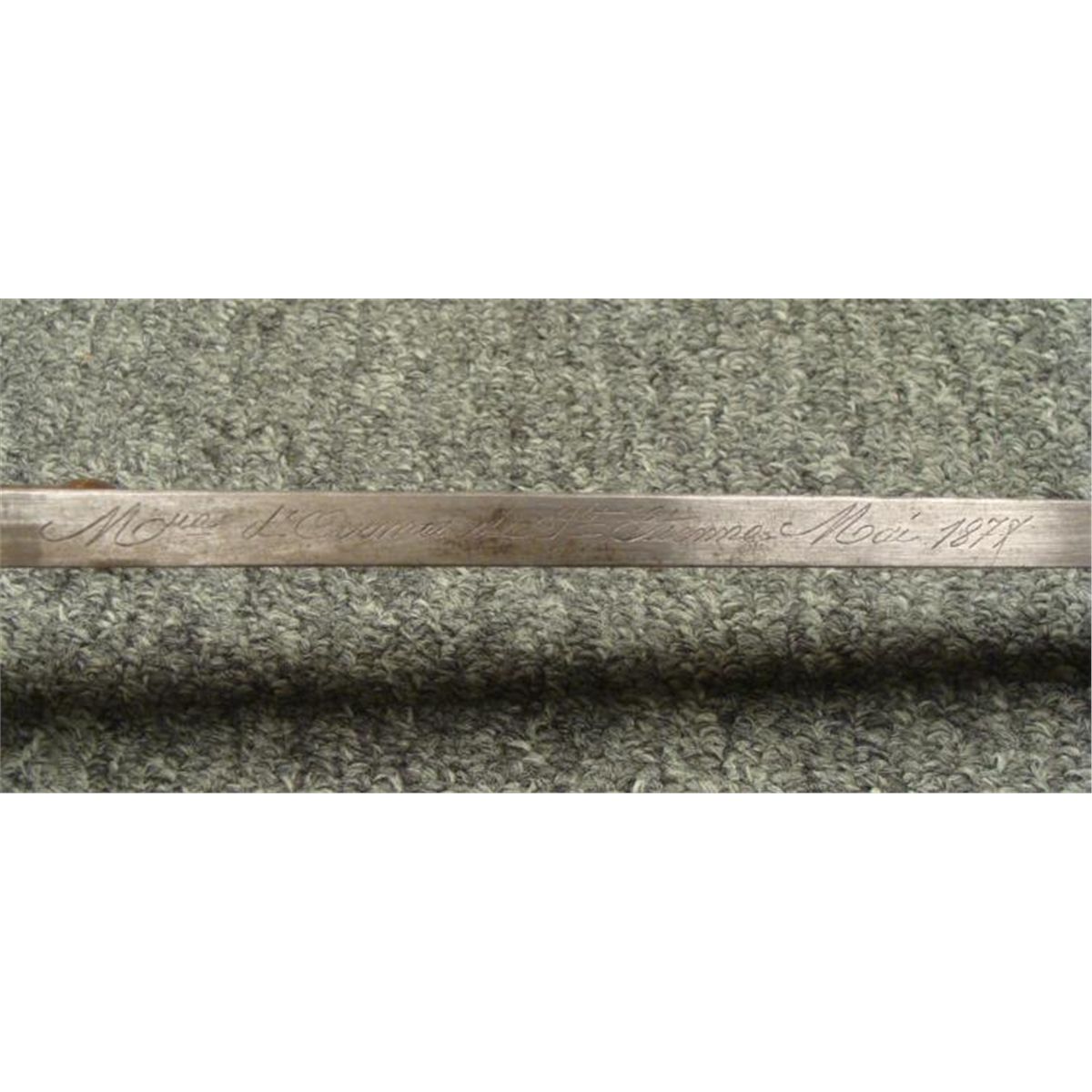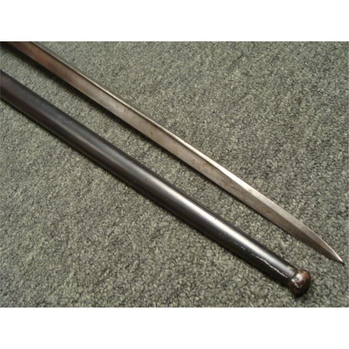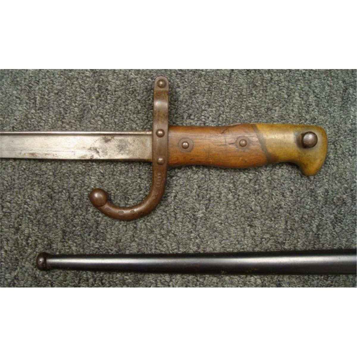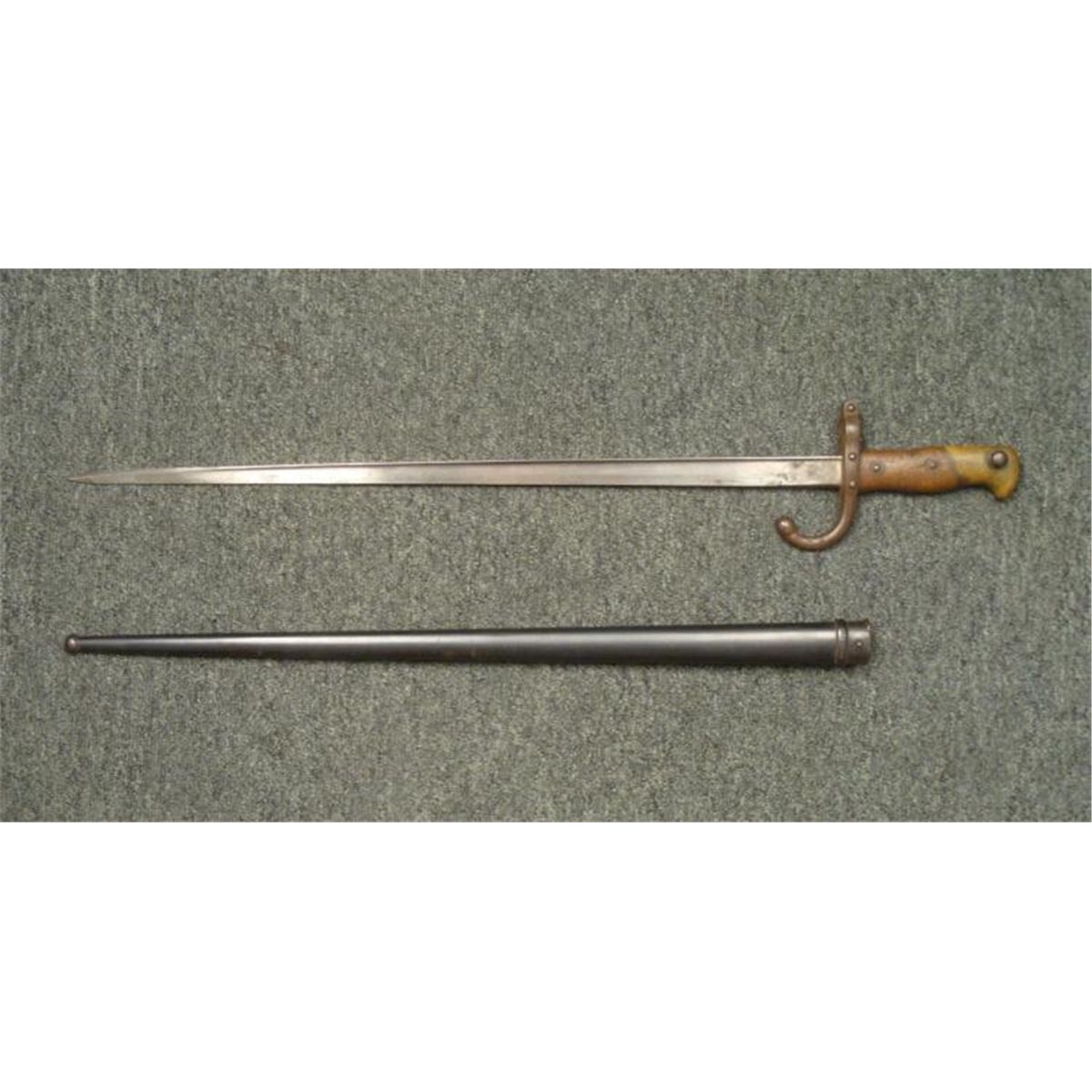 OFFERED HERE IS A FRENCH M1874 EPEE SWORD BAYONET & SCABBARD AND IS MARKER 1877. * THE BRASS POMMEL HAS A WORKING RELEASE BUTTON. THE SWORD IS 26" LONG WITH WOOD GRIPS, A HOOKED CROSSGUARD AND NUMBERED SCABBARD. THE BLADE'S SPINE IS CURSIVELY ETCHED ST ETIENNE ARSENAL-MAY 1877. THE SCABBARD IS NEAR MINT CONDITION. THIS IS NICE, CLEAN ORIGINAL SWORD BAYONET AND SCABBARD. *