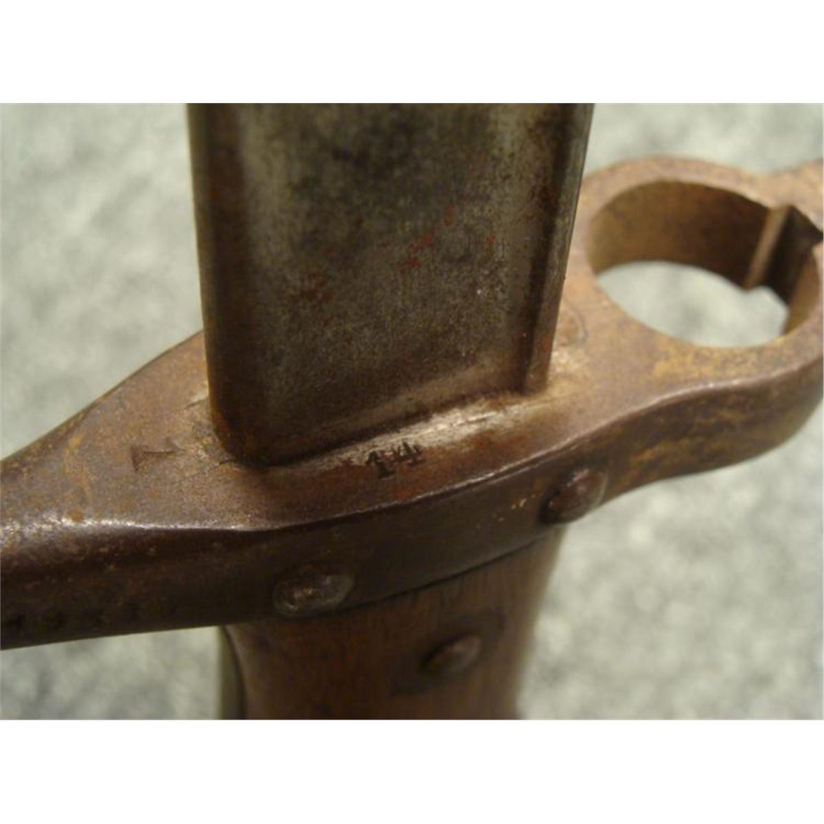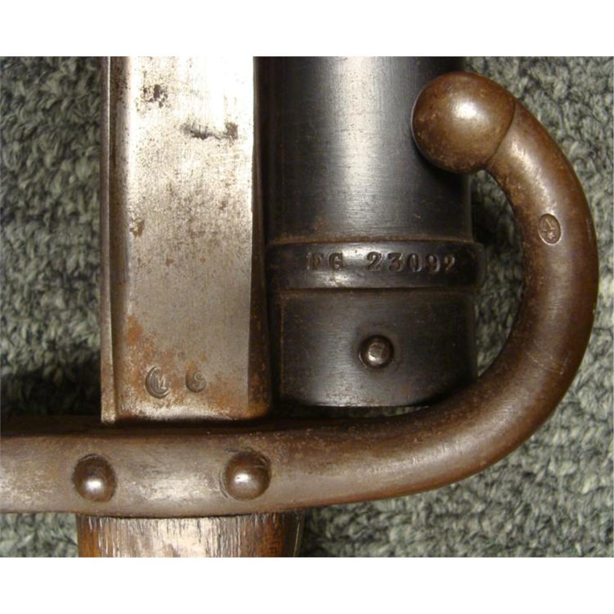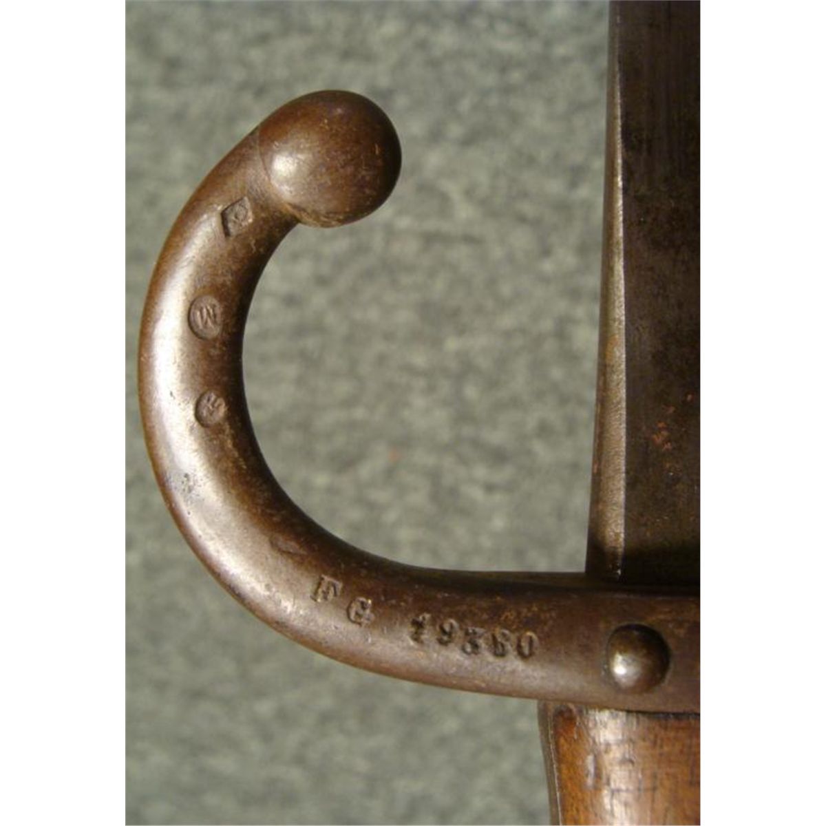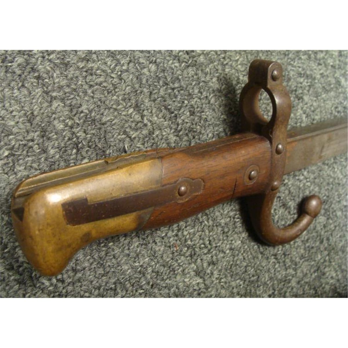 OFFERED HERE IS A FRENCH M1874 EPEE SWORD BAYONET & SCABBARD AND IS MARKER 1877. * THE BRASS POMMEL HAS A WORKING RELEASE BUTTON. THE SWORD IS 26" LONG WITH WOOD GRIPS, A HOOKED CROSSGUARD AND NUMBERED SCABBARD. THE BLADE'S SPINE IS CURSIVELY ETCHED ST ETIENNE ARSENAL-MAY 1877. THE SCABBARD IS NEAR MINT CONDITION. THIS IS NICE, CLEAN ORIGINAL SWORD BAYONET AND SCABBARD. *