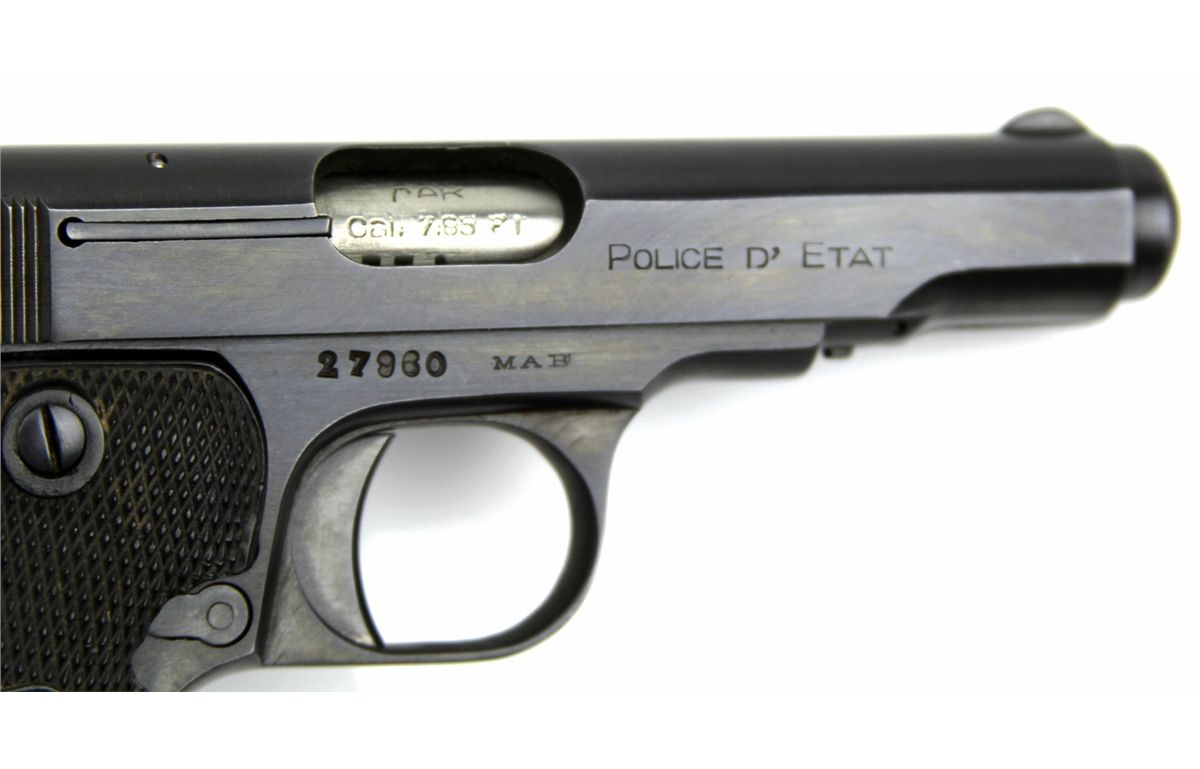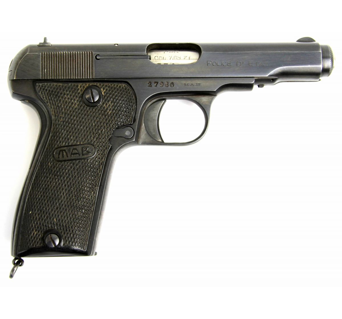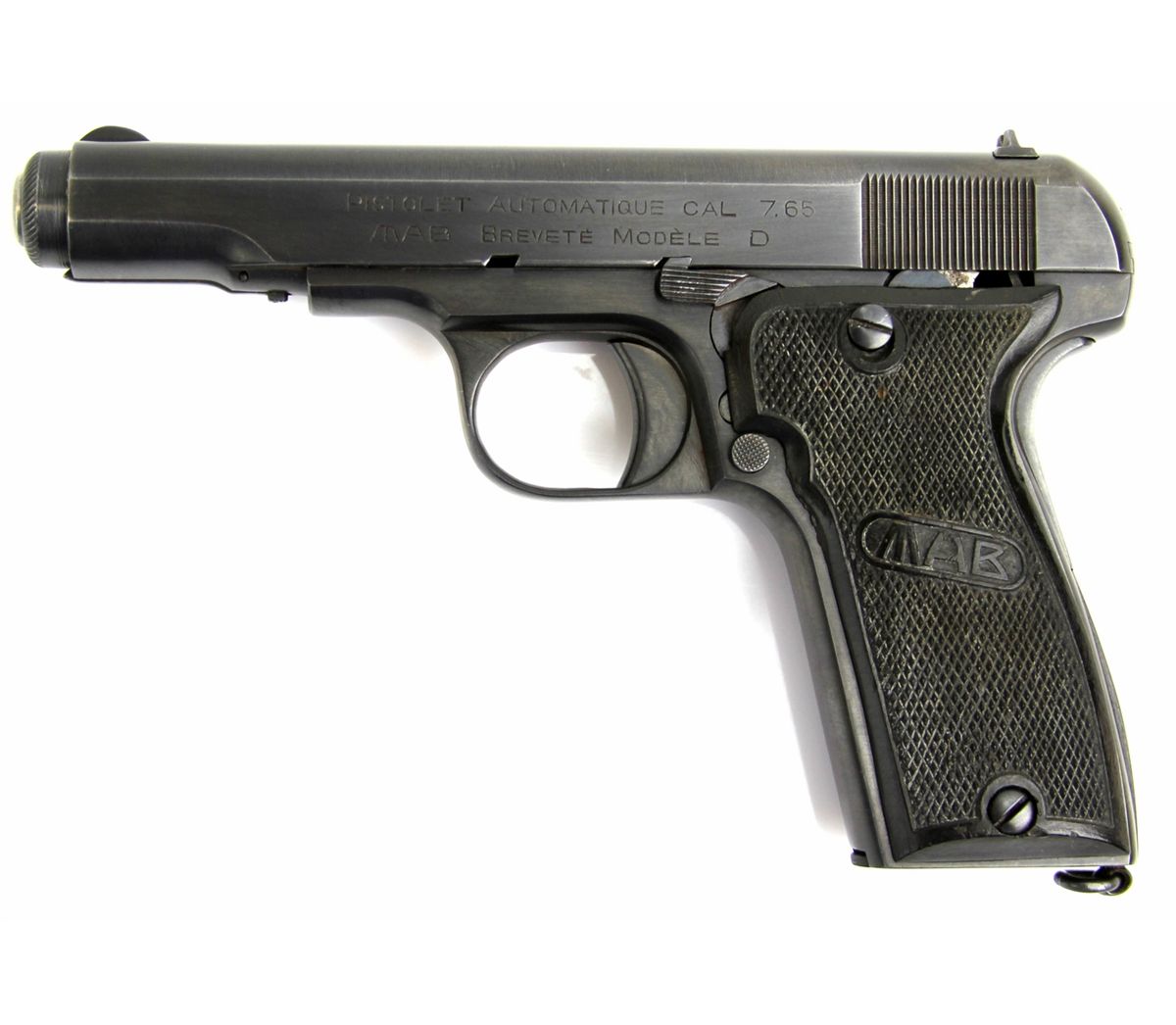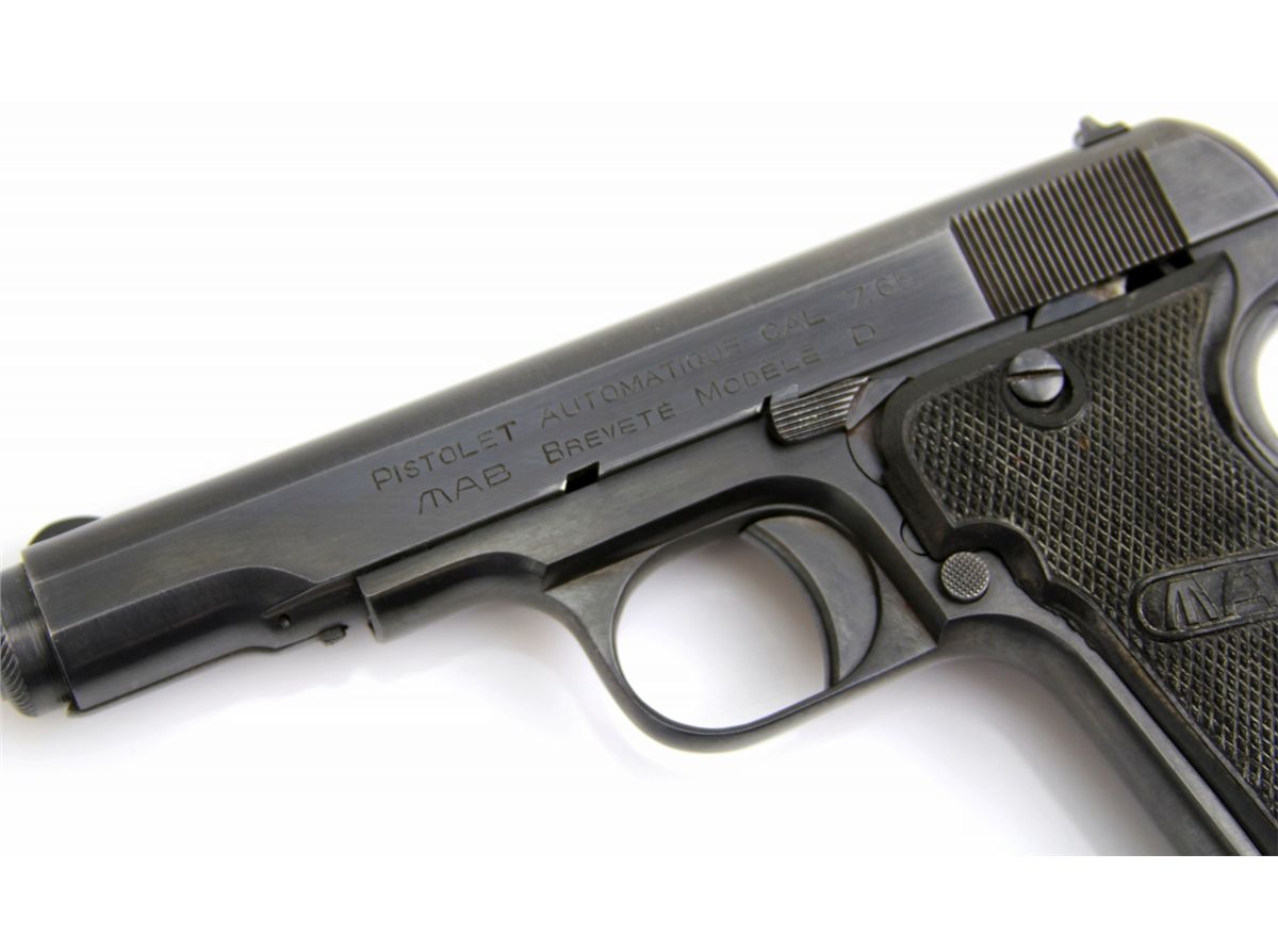 FRENCH MAB MODELE D 7.65 PISTOL STATE POLICE French made MAB (Manufacture d'armes de Bayonne) Brevete Modele D pistol. Marked "PISTOLET AUTOMATIQUE CAL 7.65 MAB BREVETE MODELED" on left side of slide, and "POLICE D' ETAT" (State Police) on right side. Type: pistol Manufacturer: MAB Model: Model D Caliber / Gauge: 7.65mm Serial Number: 27960 Condition: Bore is very good, bluing about 90%, and grips very good.