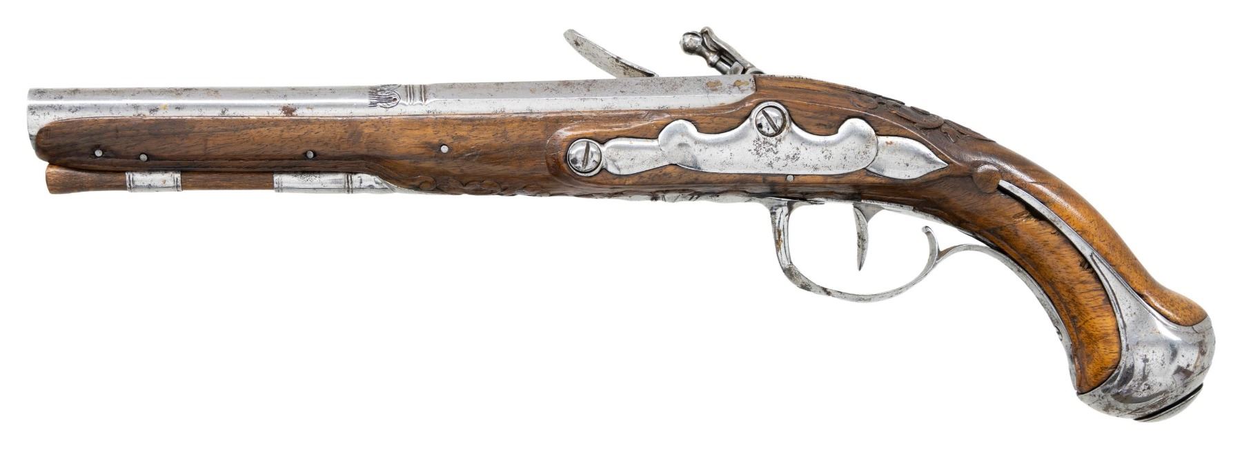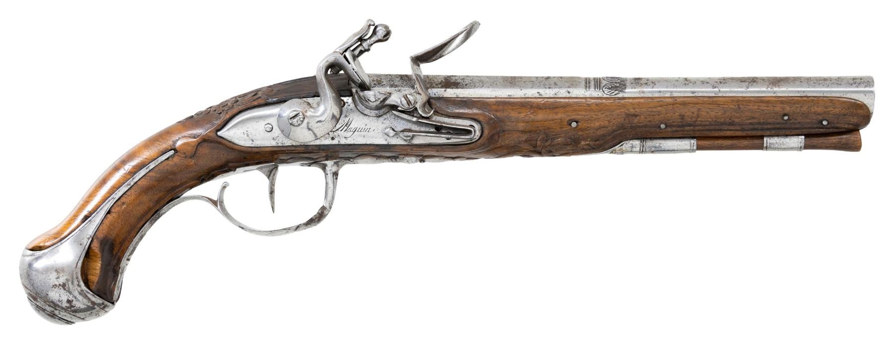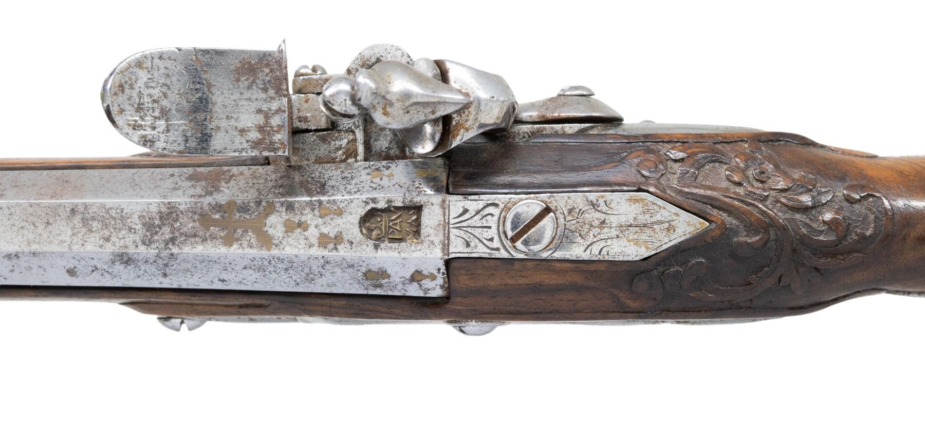 Cal. 58. NSN. Bbl. 8 1/4". Flintlock pistol produced by the Maguin family of French gunsmiths in the 19th century. Lockplate is marked "Maguin" in script. Top of the bbl. is marked with a brass crown over "PAV/ MAS" and features a band and light engraving towards the center. Full length wood stock features relief foliate carving around the bbl. tang and thimble, with relief carving following the contour of the trigger guard and finial. Iron sideplate, butt cap, trigger guard, thimble, and pipe. CONDITION: metal components exhibit a bright cleaned appearance, showing scattered spots of light surface oxidation and age related discoloration. Action holds at half and full cock, with the trigger also releasing the hammer at half cock. Stock shows scattered marks and impressions from handling and storage, with chips and cracks present on the wrist and and around the butt cap / trigger guard areas. PROVENANCE: Estate Collection of Nicholas Apergis. (01-27529/MLW). ANTIQUE. $1,000-1,500.