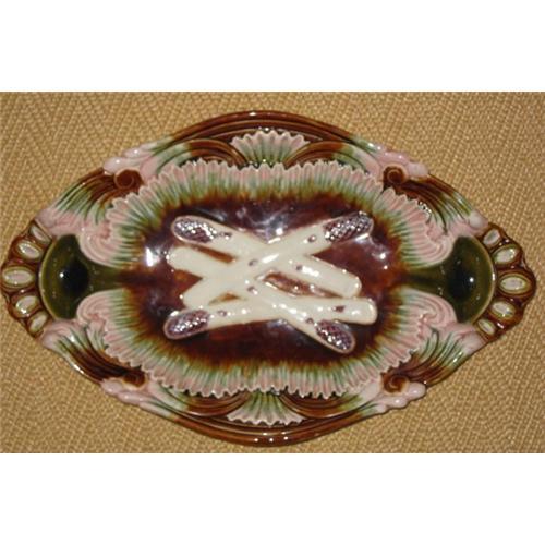 FROM FRANCE TO YOU ANTIQUE IS PROUD TO OFFER: THIS WONDERFUL EXAMPLE OF 19C FRENCH MAJOLICA. THIS SUPERB MAJOLICA ASPARAGUS DISH IS IN ALL THE GREAT BOOKS ON THIS SUBJECT: MARYSE BOTTERO AND THE OTHERS. THIS DISH IS VERY RARE. THE COULOURS ARE RICH AND THE DESIGN IS VERY CRISP. BURNT GOLD FOR THE BACKGROUND WITH ACCENTS OF PINK AND GREEN. THIS DISH IS IN GREAT CONDITION, BUT NOT PERFECT, IT HAS A HAIRLINE THAT APEARS FROM THE CENTER TO THE RIM, MOSTLY SEEN AT THE BACK AND ALSO A LITTLE ON THE TOP, PLEASE SEE PHOTOS. THIS DISH IS QUITE HEAVY! THIS ITEM IS MARKED WITH A NUMBER, AND THE OLD STORE STAMP IS STILL IN PLACE. IN ALL THE BOOKS THIS DISH HAS THE PATTERN NUMBER #23.