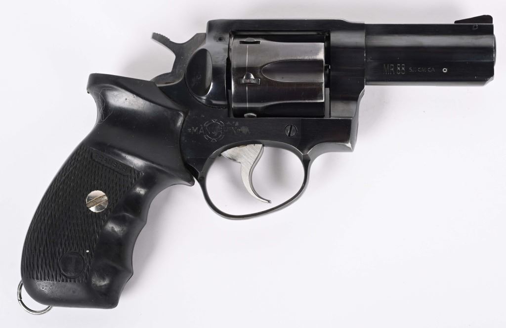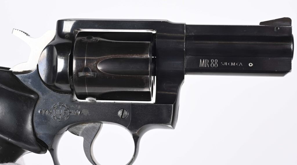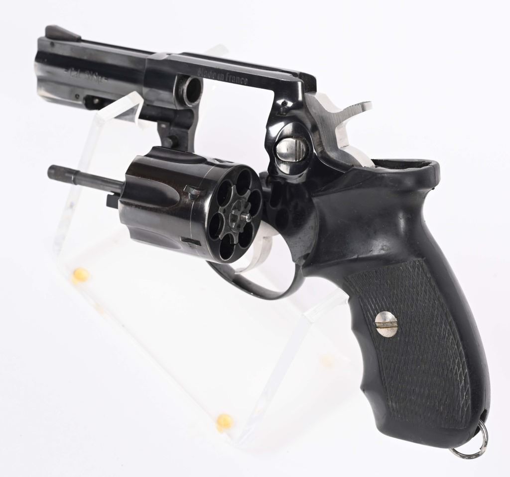 SERIAL NUMBER: FDO3682. BARREL: 3". CALIBER: .38 SPECIAL. MANUFACTURED: 1990'S. Made in France and imported by "SJI" as marked on the barrel. Six shot fluted cylinder. Solid rib, with blade front sight and u-notch rear. Factory blued finish and checkered rubber grips. Lanyard ring stud is present, as is the ring. Includes an original hard plastic case. CONDITION: Metal is very good overall, with light scratches and handling marks in the finish. Grip has light wear. Bore is shiny with crisp rifling. Sharp mechanics. Case has light wear. MODERN