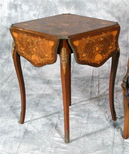 FRENCH MARQUETRY SIDE TABLE with drop sides, 23"x23"x29", condition: finish wear to top, circa 1900, SHIPPING: See recommended third party shippers. This item can't be packed or shipped by seller.