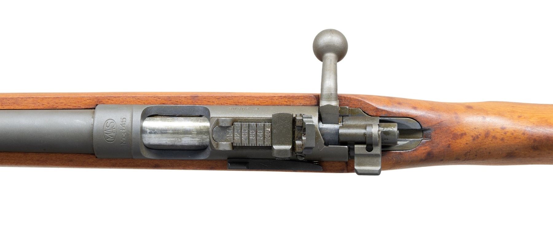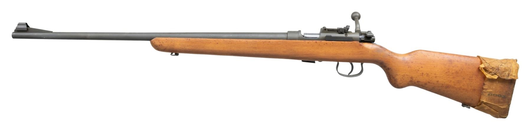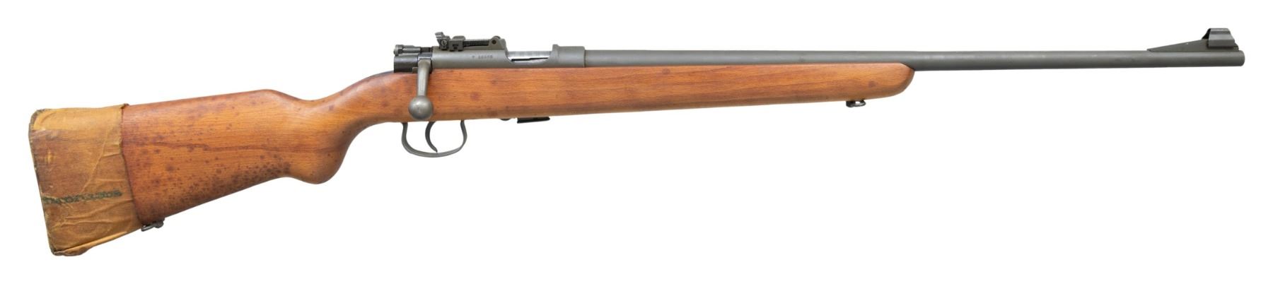 Cal. 22 LR. S# F29506. Bbl. 24" with Davidson's import marking. Ramped blade front sight with hood. Adjustable aperture rear sight graduated to 150m. Matching numbers on receiver & underside of bolt body. Arsenal parkerized finish. Beech stock set with bottom mounted sling swivels MAGS: 1-5 rd. CONDITION: stock set has arsenal wax paper present on butt with a large area of worn finish underneath, scattered black staining & handling wear. Metal retains 92% arsenal rework parkerized finish with scattered edge wear, handling marks & light oxidation spots. Action functions properly when hand cycled. Bright near excellent bore. (25-3101/MJC). CURIO. $300-500.