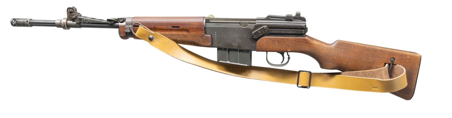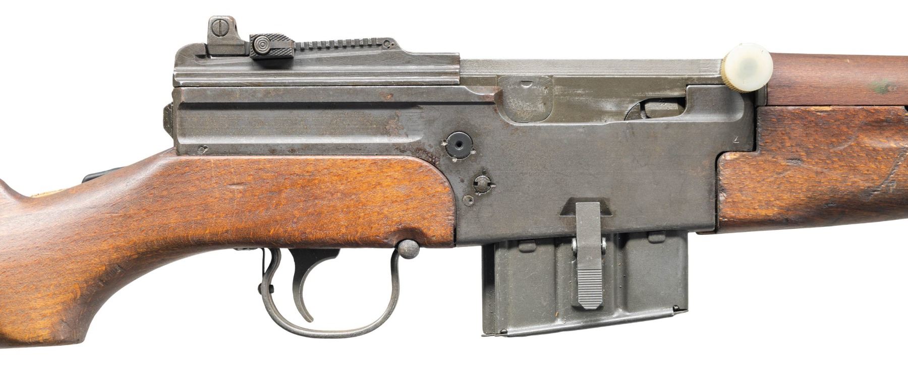 Cal. 308 Win. S# G13584. Bbl. 22 3/4" with grenade launcher. Standard MAS-49/56 sights. Top cover has mismatch number. French MAS-49/56 converted from 7.5 French to .308 by Century Arms. Left side rail has Century import marking. Left side of receiver has boxed "P83" arsenal refurb stamp. Parkerized finish. Beech stock set with left side sling swivels & tan French sling. MAGS: 2-10 rd. detachable. CONDITION: stock set shows some dings, handling marks & worn finish. Metal retains 80% arsenal rework parkerized finish with scattered edge wear, silvering, handling marks & some sparse light oxidation. Bolt does not stay open on empty mag but action is otherwise functional when hand cycled. Bore shows scattered oxidation, pitting & dried grease but good rifling. (25-3802/MJC). CURIO. $400-600.