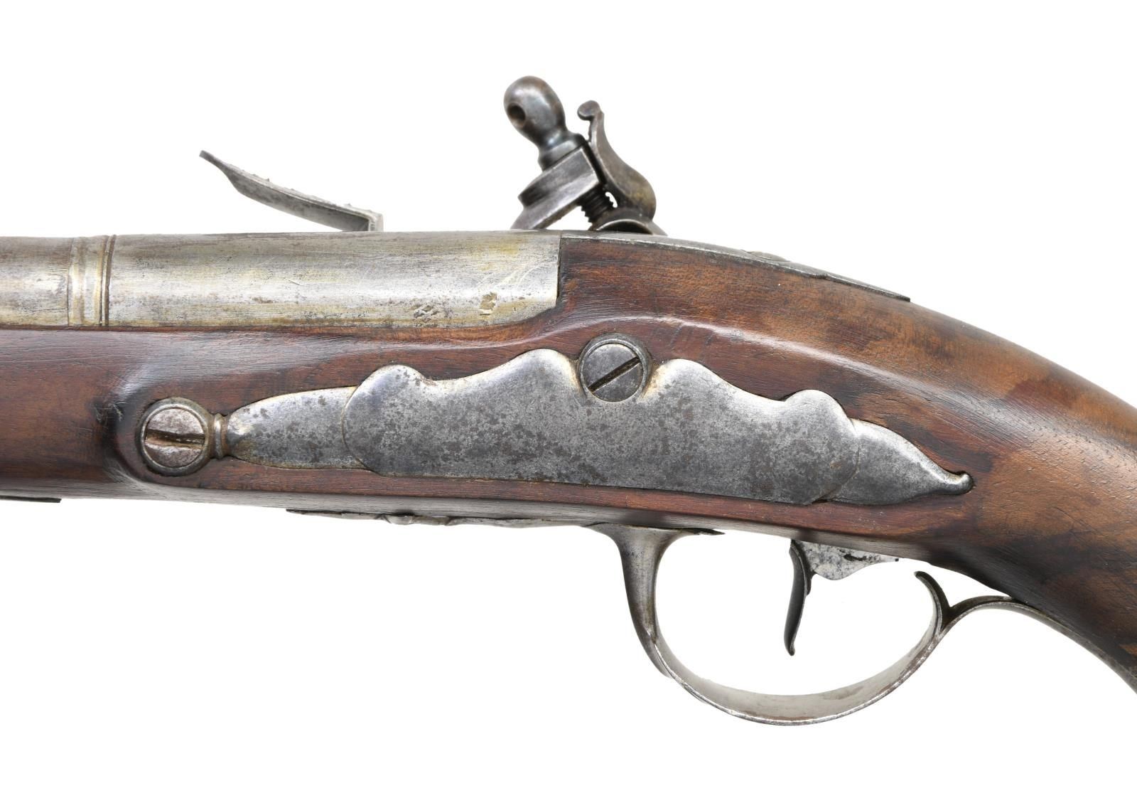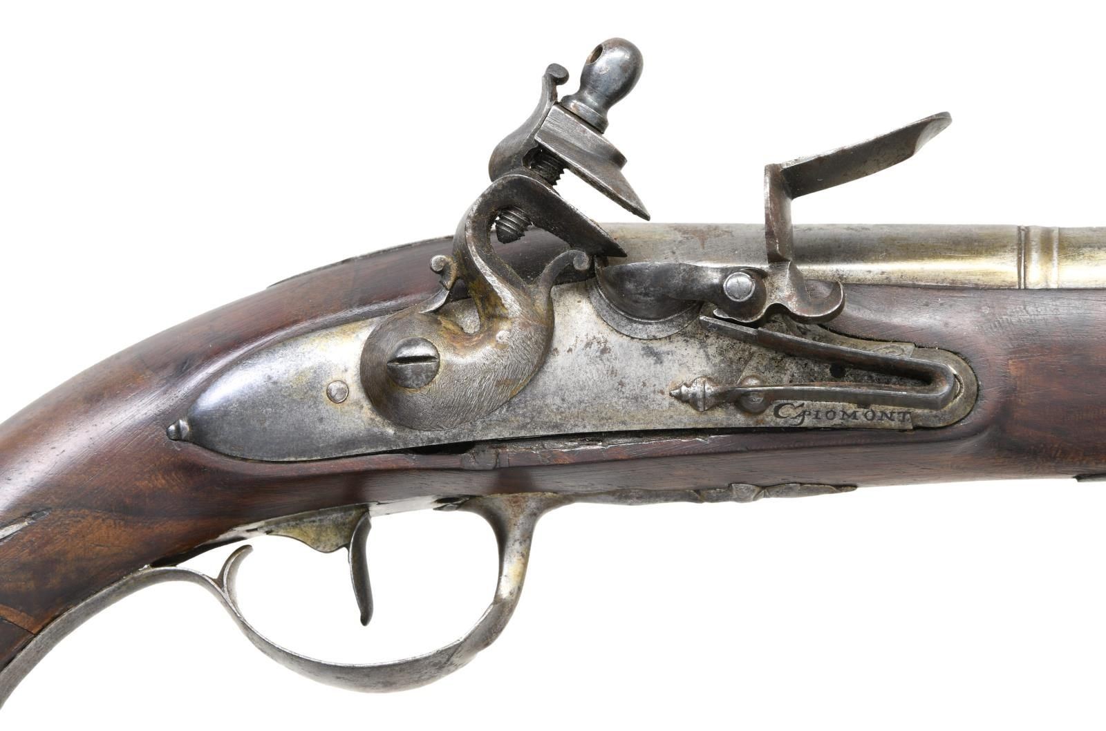 Cal. 60. NSN. Bbl. 6 5/8" round w/ faceted transition & cannonade muzzle. Forward portion of lock above frizzen spring is engraved "Metz", apparently referring to the French city. Area below frizzen spring is marked w/ a word that may read "Criomont". Pin fastened walnut stock. Iron fittings consist of buttcap, acorn finial trigger guard, sideplate, thimble & pipe. Hardwood ramrod. CONDITION: white finished metal shows a spotted light tarnish. Refinished stock is repaired through butt section w/ repaired cracks in forearm area. Sound lock has stiff operation. Dark bore shows spots of pitting. (01-25173/DS). ANTIQUE. $800-1,200.