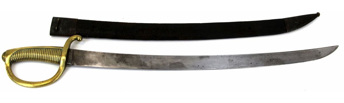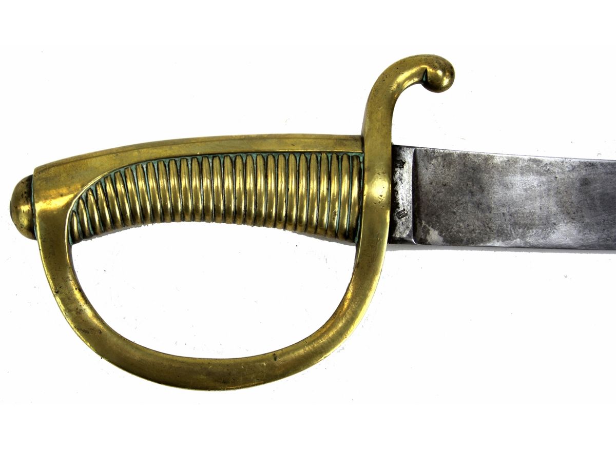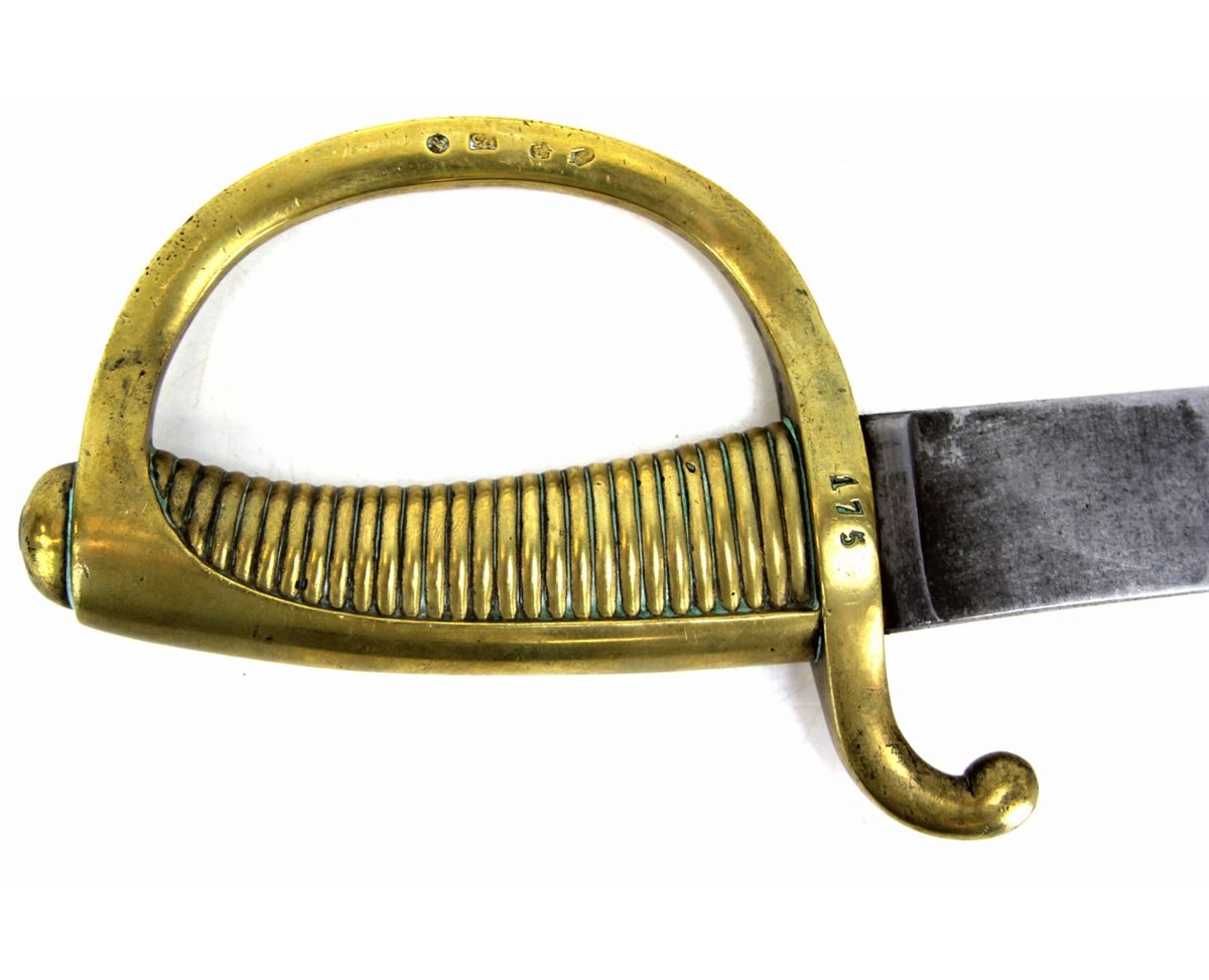 FRENCH MODEL 1804 NAVAL CUTLASS KLINGENTHAL MARKED French Model 1804 Naval Cutlas (Sabre de Marine Briquet ) with Klingenthal Armory mark on back of blade, dated 1831, and inspection stamp of Director Jean Baptiste Regneault. Curved blade with no fuller measures just over 23 inches in length. One piece brass hilt, with "D" knuckle bow, and rack number 175 on quillon. French inspection poincons on knuckle bow indicate inspection by Captain Colliot de la Hattais, Acting Director March 14, 1832; Jean Georges Bick, First Class Controller; Joseph Ambrose Bisch, Second Class Controller. Leather scabbard with brass throat and chape. Type: Sword Country: France Blade Length: 23 inches Condition: Mellow grey patina to blade, hilt excellent. Expected age to leather n scabbard, and tarnish on fittings, but otherwise intact and very good. Overall very good.