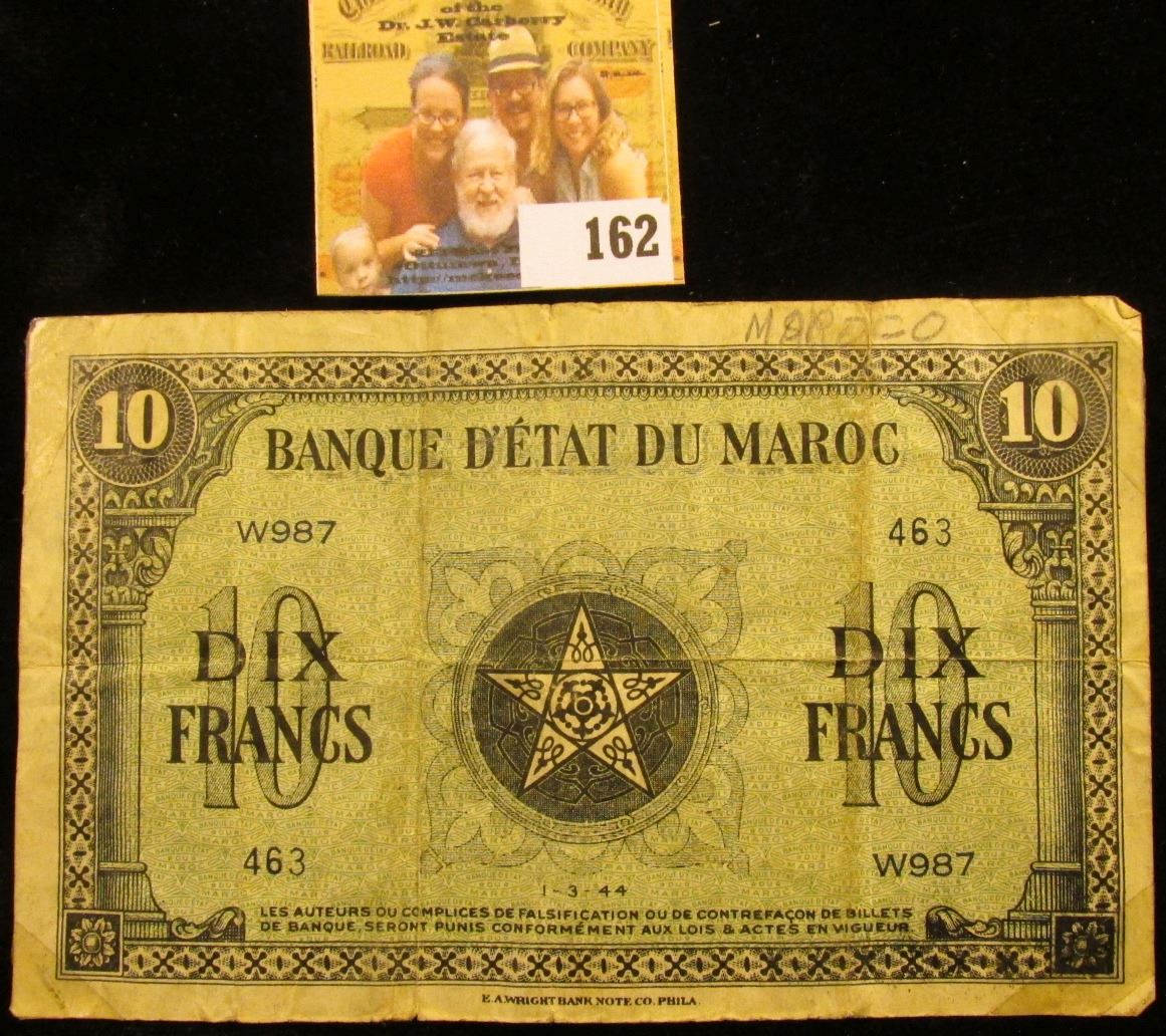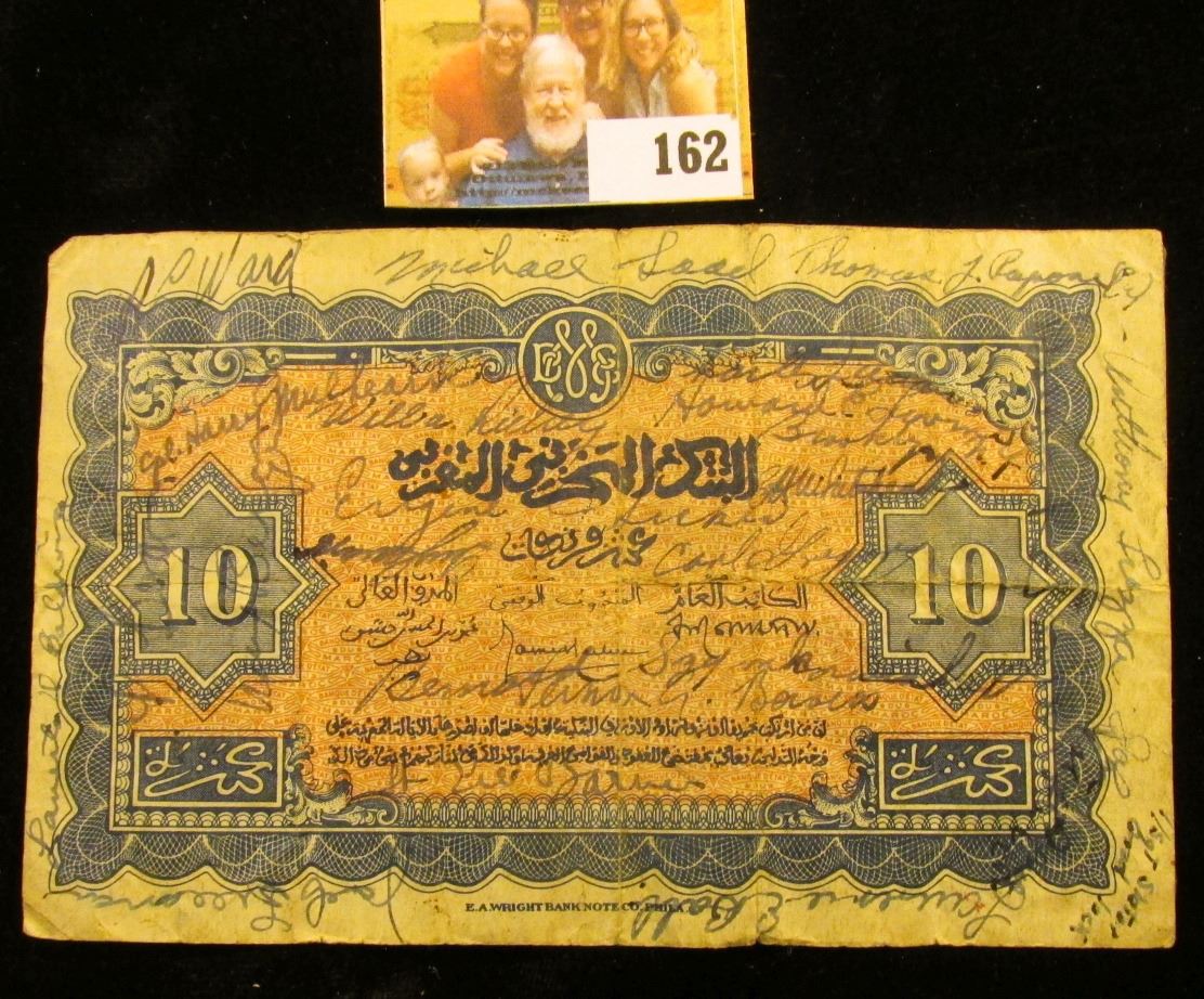 FRENCH MORROCCO TEN DIX NOTE "SHORT SNORTER" DATED 1944. SHORT SNORTERS ARE NOTES THAT ARE SIGNED. USUALLY GUYS IN THE MILITARY WILL GET A SIGNATURE FROM THEIR BUDDIES THEY SERVED WITH.