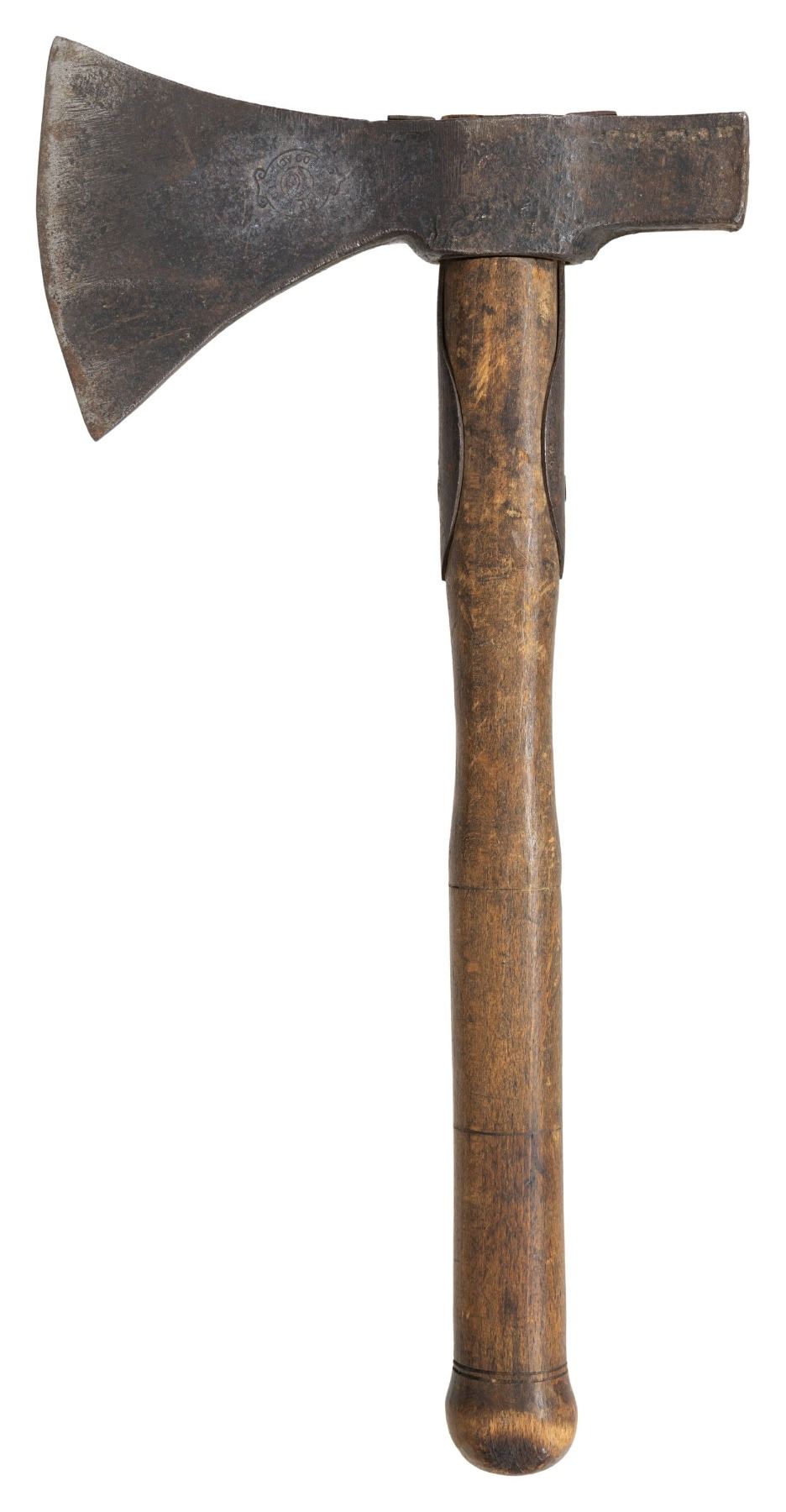 This fine early boarding or ships ax dates to about 1835 and measures about 14" overall with a 7 1/2" head. The bit is about 4 1/4" and at the opposite end is a 4 sided hammer head. The cast head is marked to the Goldenburg Foundry in Alsace, France. Good early probably original round haft with incised decorative lines. separate ears extend nearly 3 1/2" down the haft. Slightly bulbous knop at the base. CONDITION: generally light wear overall with good original patina. (02-25189/BF). NON-GUN. $500-1,000.