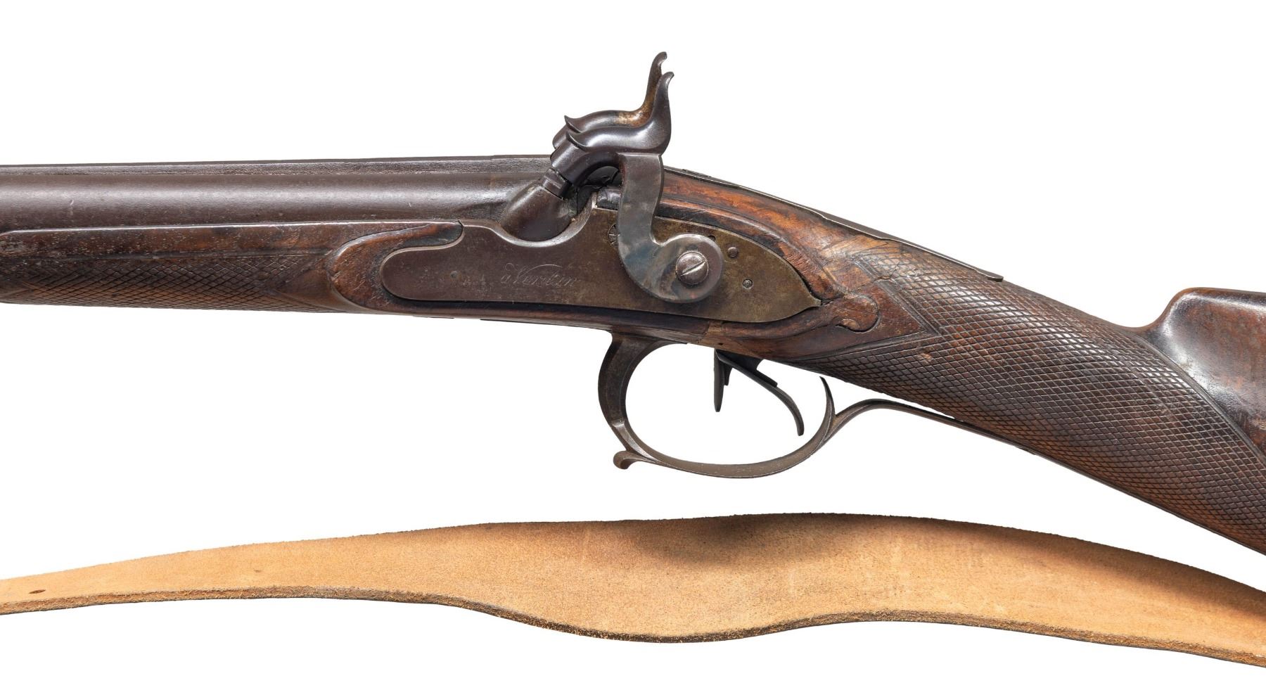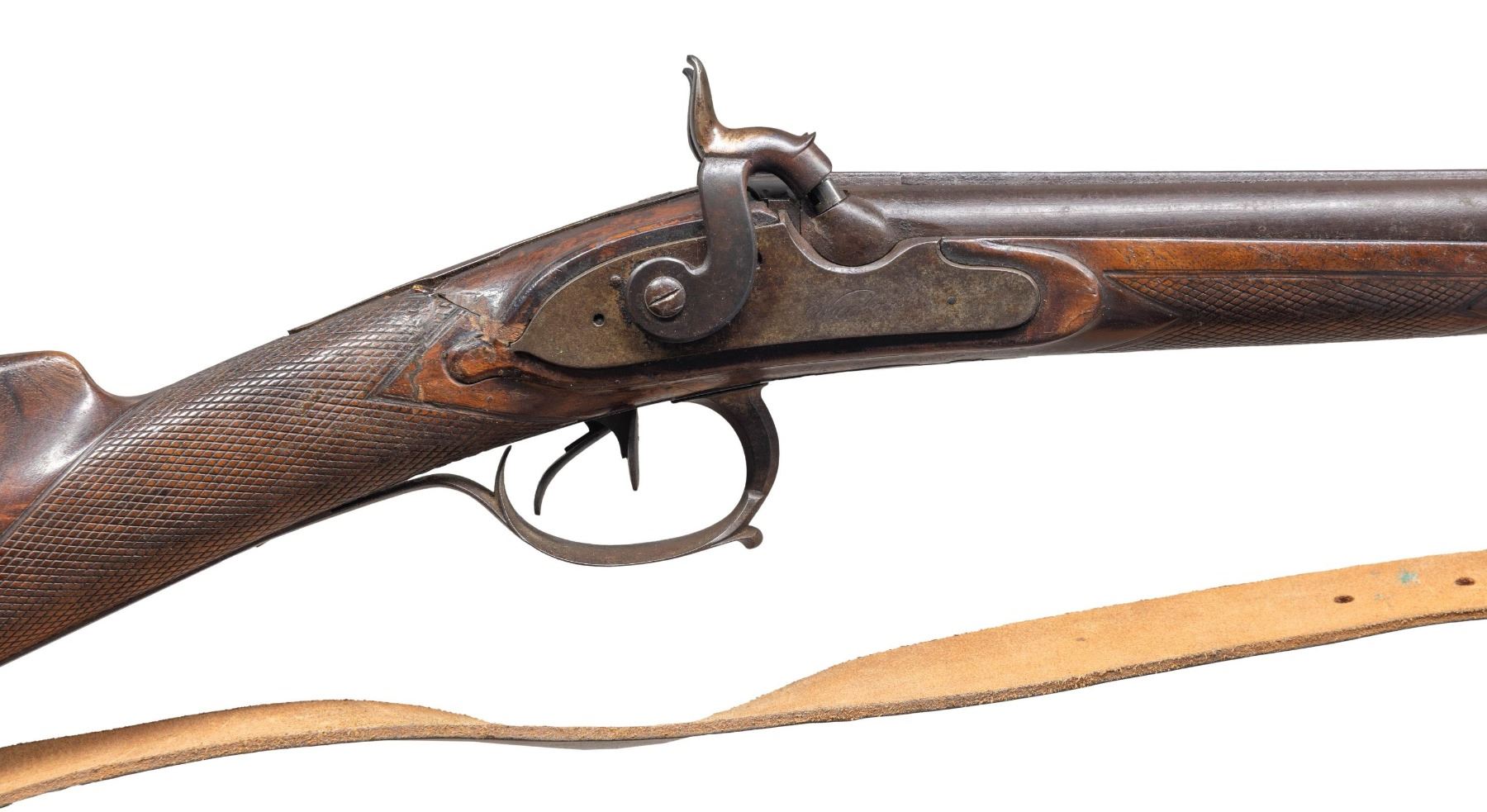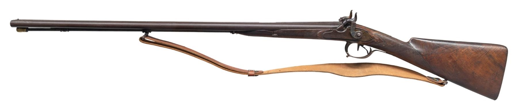 Cal. 20 Ga. (.62 cal.). NSN. Barrels 30.75" w/ front stud. Dbl. triggers. Modern replacement nipples. Checkered walnut stock w/ wedge fastener, modern sling on swivels & modern replacement ramrod. CONDITION: metal has brown patina appearance with corrosion & marks. Stock has worn finish, large repaired cracks, & wood inlet repairs. Dark pitted bores. Mechanically fine. (01-27812/MD). ANTIQUE. $150-250.