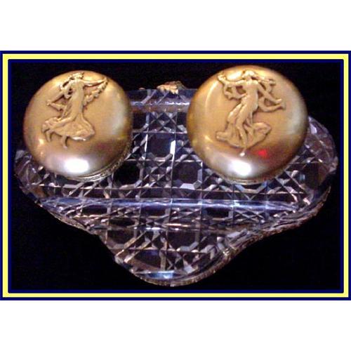 Art Nouveau gilt and cut crystal double inkwell with pen holder. French, 19th century.<BR>Measures 5 3/4inches accross. 3 1/2inches front to back.<BR>Finest French cut crystal with gilt metal mounts. This piece has to be examined from every angle and side to appreciate the tremendous workmanship. the shape is oval with a round front. Underneath is beautifully, beautifully cut crystal. Top corner of glass is canted. Around the front is a border of gold acorns and oak leaves. At the back this extends all the way up the side and turns over to the top of the crystal in the form of swags, flowers and foliage in exquisite detail. The inkwells are similarly decorated with acorn and oak openwork on the bottom. The metal caps have applied gold Art Nouveau figures of maidens in diaphenous robes, dancing. Superb.<BR>Condition is great. One metal cap has the most negligible of dings, scarcely a shadow and mentioned only for the sake of accuracy. Hinges are firm, glass is utterly MINT.