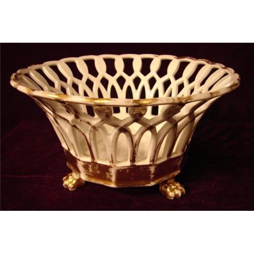 Circa 1875 Reticulated Footed Based Compote with a worn just right gold gilding on top rim and reticulated branches and bottom base on outside in addition to the paw feet. Good Condition and nice Quality. The plain white with the gold is very striking. Diameter at the top opening is 9 1/4" and the height from the feet is 5 1/4" and the inside depth is 4 1/2". I know "ONLY IF THEY WERE A PAIR". Well unfortunately the matching compote had a very bad accident and is now in about 40 pieces. But one would look great at Christmas time with small gold ornaments in it.