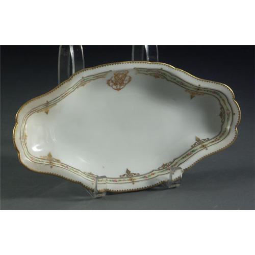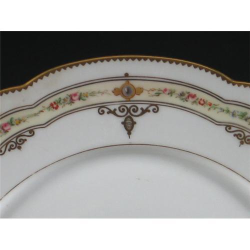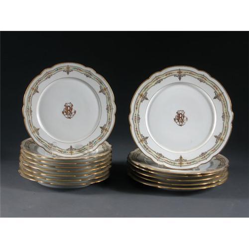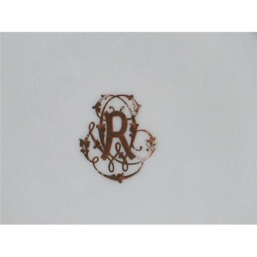 HISTORICAL CHINA WARE: A rare assorted lot of six dinner plates 9'', eight luncheon or salad plates 8'', and one pickle or relish dish 10 ¬'', each plate is white in color with a one inch floral rose rim trim outlined in undulating gold and black trim. The plates were ordered from the firm of Charles Pillivuyt, a French porcelain firm founded in 1818, the mark dating from 1854. The firm is still in business. Each plate has in the center an elaborate scroll work containing the initials ''R'' standing for William Chapman Ralston (1826 - 1875), the dynamic driving force of early San Francisco determined to make San Francisco one of the worlds cultural and financial capitals. He was at his peak of his influence in 1860-1870's, when in 1864 he created the Bank of California, controller for many years of the Comstock Lode, entrepreneur extraordinaire, and few other chosen words. He died in 1875 from one of several reasons while swimming in San Francisco bay. He has just lost control of his beloved bank. An estimated 50,000 people attended his funeral. This rare reminder was part of a lavish set put up for auction by one of his direct decedents. These are both historical and represent San Francisco's standard for the rich during the cities founding days. Note: Some plates show wear of the ''R'', and outer rim areas, flea chip on one or two base rims of the plates but over all condition is very good..