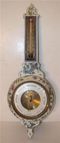 FRENCH PORCELAIN WALL BAROMETER. Hand painted floral decorated porcelain case. Barometer face is marked “Brevet/S GDG/Paris/Lemaire Opticien a Bruxesses/Marque de Fabrique”. Reverse is marked with monogrammed mark that contains the letters E, G, I, & N