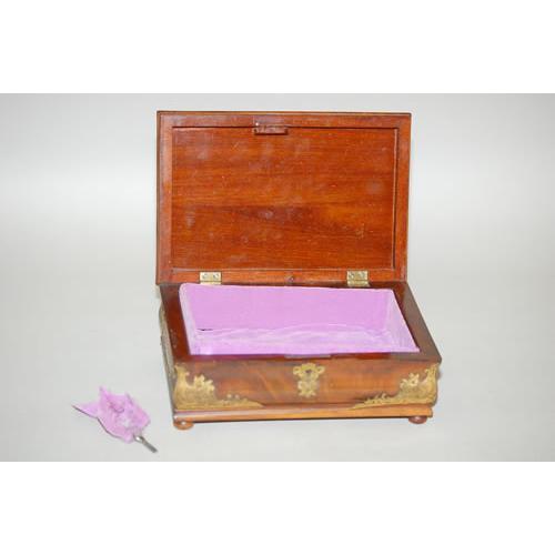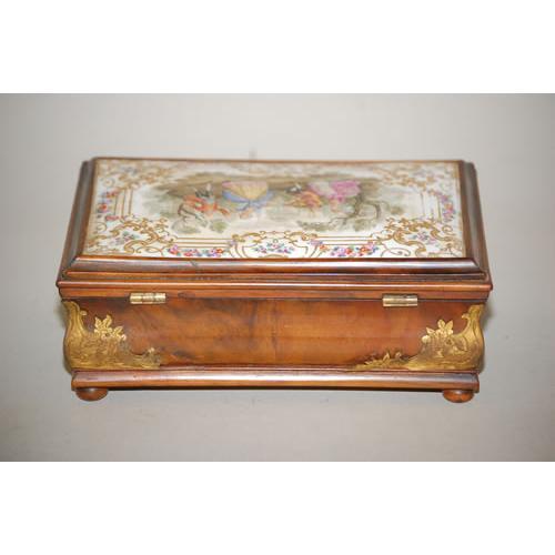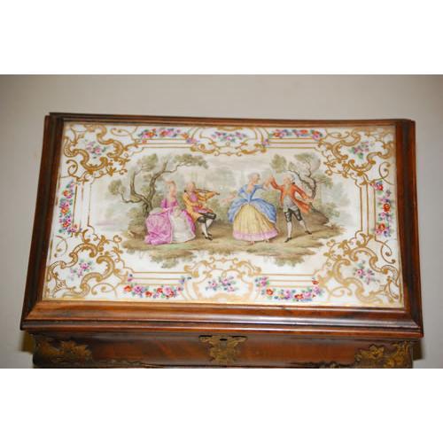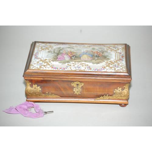 FRENCH PORCELAIN TOP JEWELRY CASKET - 20TH CENT. FORMAL FRENCH MAHOGANY DRESSER BOX W/ ORMOLU MOUNTS & PURPLE VELVET LINER W/ A DECORATED PORCELAIN PLAQUE LID DEPICTING 2 ROMANTIC COUPLES - WEAR, LOSSES, IMPERFECTIONS