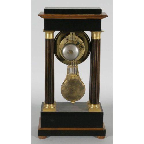 FRENCH PORTICO CLOCK, with line inlay, 19" high, mid-19th century, CONDITION REPORT: no problems. PACKING AND SHIPPING: We offer packing (double boxed in most cases) and shipping of this item within the Continental United States by USPS or UPS (our choice- boxes over 30lbs or oversized may be recalculated based on buyer's location), NOT INCLUDING INSURANCE (it will be added when we know the sales price) for $40