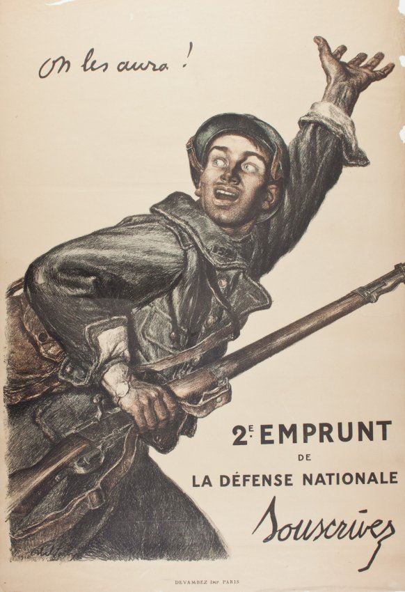World War I French propaganda poster, 31" x 45", Jules-Abel Faivre's famous 1915 image of a French poilu quoting Marshal Foch: "On les aura!" and supporting a war bond drive. But for a tear at the top margin and some marginal chips, in excellent condition.