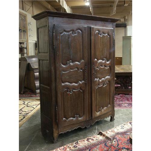 ARMOIRE: French provincial oak 19th century armoire, molded cornice, carved and molded door panels, inner two shelves. 82''h x 19''d x 57''w