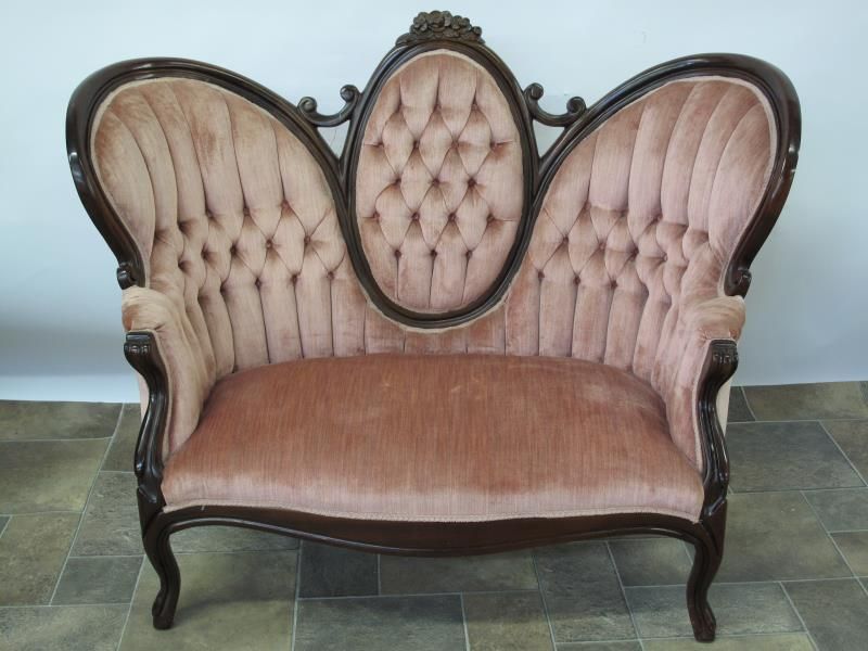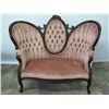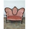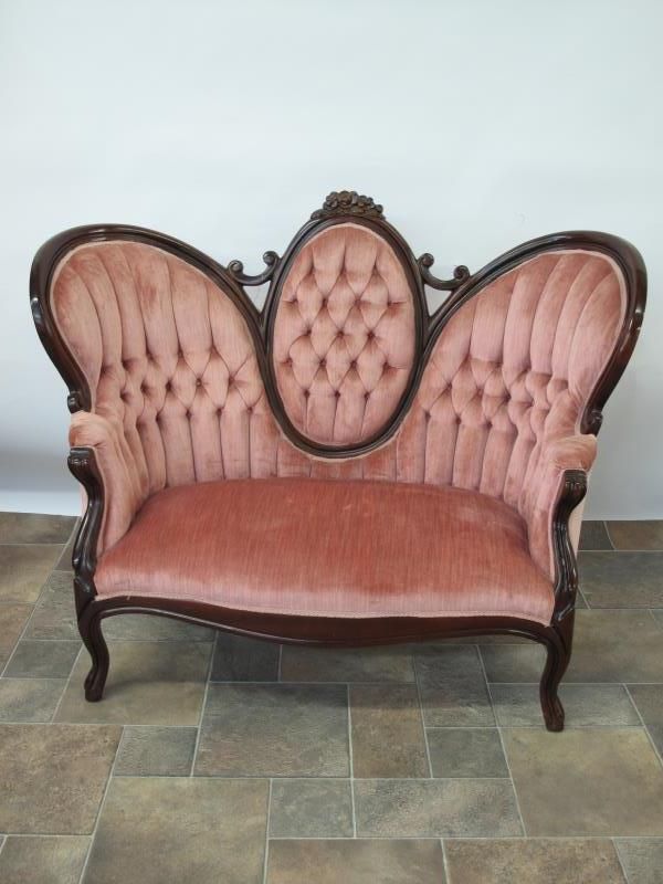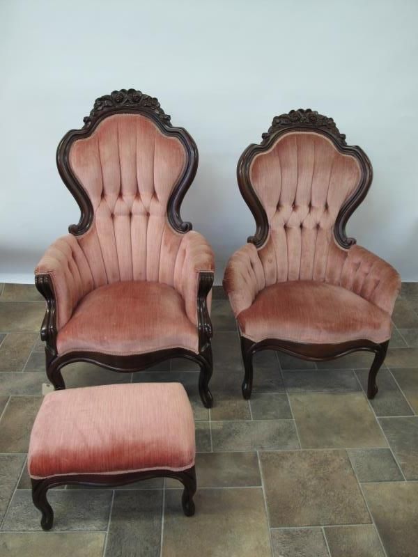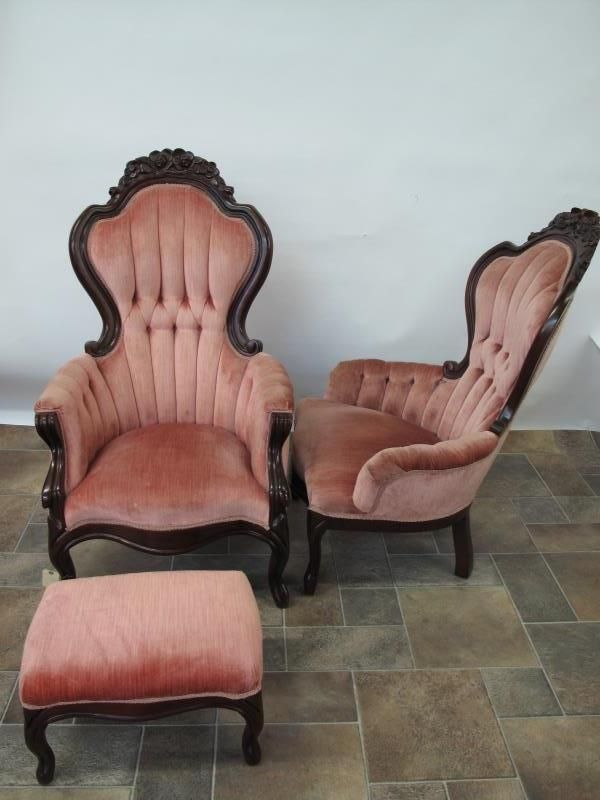 -four piece set with two matching armchairs and a matching sofa, small foot stool, upholstered with a pink material.