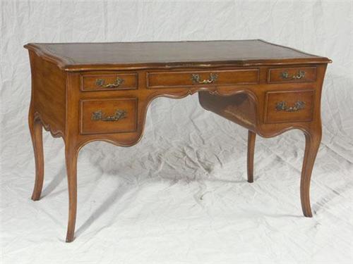 DESK: French Provincial style fruitwood desk, scalloped top with tooled leather writing surface, cabriole legs, decorative brass hardware. 30''h x 26''d x 48''w
