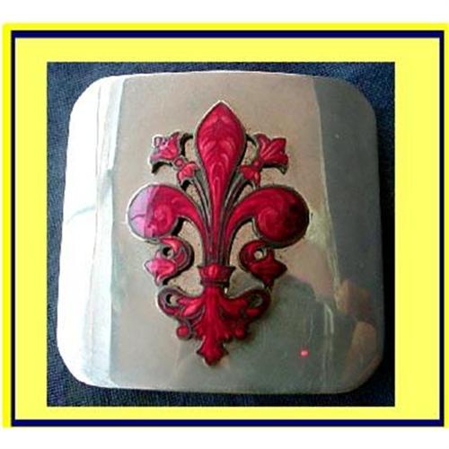 Superb red guilloche enamel on silver metal buckle. Made France, 19th century. 3 1/8inch X 3inches. Top quality and very rare red coloured guilloche enamel in the form of a fleur de lis. The enamel includes swirling foliate patterns within the petals of the flower. Sits atop a rounded rectangular buckle. There are no hallmarks to be seen and while guilloche enamel is normally set on sterling, we must assume this is high quality steel. Double loops at the back. Excellent condition with no damage to either the enamel or the silver backing.