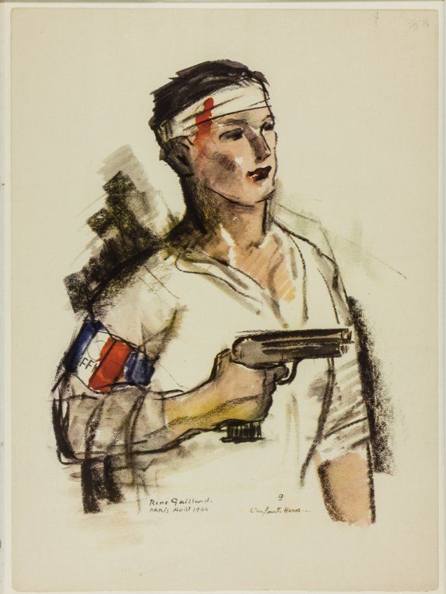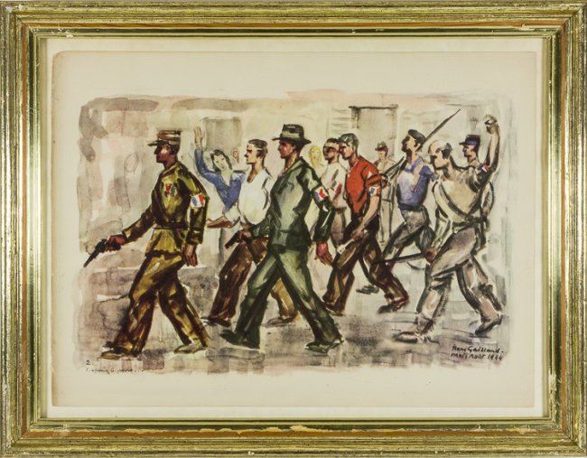 Pair of lithographs of watercolor paintings by French Resistance fighter and artist Lt. Rene Gaillard, each 11" x 15", variously depicting armed FFI fighters marching in the streets of Paris, and a half-length view of a pistol-wielding FFI fighter with a bandaged head wound, both prints signed in the plate and dated "Paris August 1944". These two prints were included in collection of 24 watercolors: "Pages de Gloire Liberation de Paris" (Paris: Librairie Hachette), no. 203/460, the rare limited edition printed by Velin d'Arches. Each print simply framed. Provenance: The War Museum, New York.