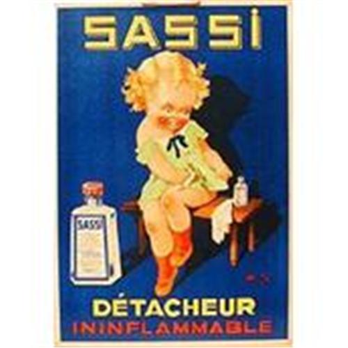 SASSI CLEANER CARDBOARD SIGN 1930, 12? x 17?, cardboard, French, cute blonde girl wiping a stain off of her dress