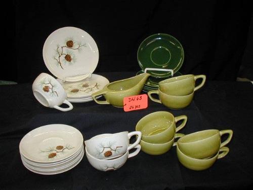 FRENCH SAXON inALOHAin INCLUDES, (6) SAUCERS EXCELLENT, (1) MEDIUM GREEN CREAMER (W/SPOUT NICKS), (6) MEDIUM GREEN CUPS (CRAZING), FRENCH SAXON inPINE CONEin (4) 7 1/8in PLATES ( 1 W/EDGE NICK), (6) SAUCERS, (3) CUPS, 26 PCS.