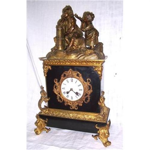 FRENCH SHELF CLOCK BELGIAN BLACK MARBLE BASE AND GRAPE HARVEST SCENE WITH TWO BOYS. GOLD BRONZE FINISHINGS. EXCELLENT CONDITIONS. WORKING CLOCK.