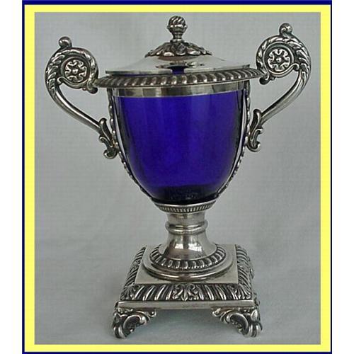 French 950 silver mustard pot, moutardier, with cobalt blue glass bowl. Made between 1803 - 1837 (before Minerve mark).<BR>5 1/2inches high. Approx 4 3/4inches accross handles. Weight of silver alone is 5oz.<BR>Urn shaped cobalt blue glass enclosed in a silver mount with hinged lid and pair of scrolling acanthus leaf decorated handles. Base of urn rests on a square platform with 4 acanthus leaf repousse shaped feet. Beautiful gadrooning and foliate patterning around base and on lid, which ends in a bud flower finial. Flowers in center of scrolls of handles. French silver of the best quality, quite beautiful. <BR>Delicate monogram on lid, TGC. <BR>Hallmark inside lid is of the 'Old Man', introduced as Paris mark for .950 silver in 1819. Outside of lid has an earlier mark, of a woman in profile facing left, also for Paris, see Tardy top of page 191. Base similarly marked.<BR>Excellent condition. No chips/cracks/dings/dents/damage of any sort.<BR>Comes with an antique bone spoon.