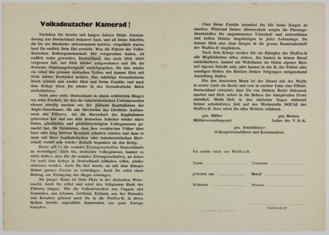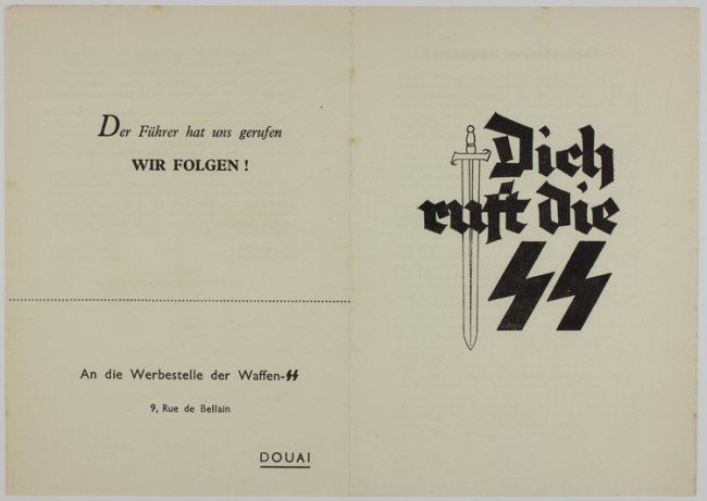 Propaganda booklet aimed at German emigrants in France, "Dich ruft die SS" ("The SS Calls You"), 4pp. 8vo., doubles as an application form, to be submitted at the SS headquarters in Douai, in northern France. It reads, in part; "Ethnic German comrade!... Germany, which has not forgotten you, has again received you and returned your German citizenship to you. You are again part of the Great German community and with pride you can call yourself a German... Germany, however, is in a bitter struggle for its freedom, which the Bolshevik subhumans are trying to wrest from her just like the Jewish capitalism of the Anglo-Americans... Just like the ethnic Germans from Hungary and Rumania, from Lithuania, Latvia, Estonia, from Slovakia and Croatia, you too belong in the Waffen-SS..." The pamphlet has a section labeled; "Ich melde mich zur Waffen-SS" ("I register for the Waffen-SS"), with spaces for the applicant's name, birth date, occupation, and address. Very minor staining, else fine. Includes a typed English translation.
