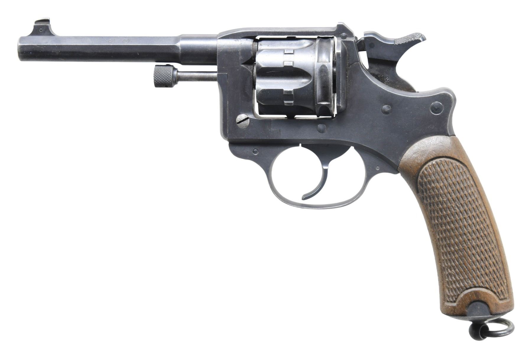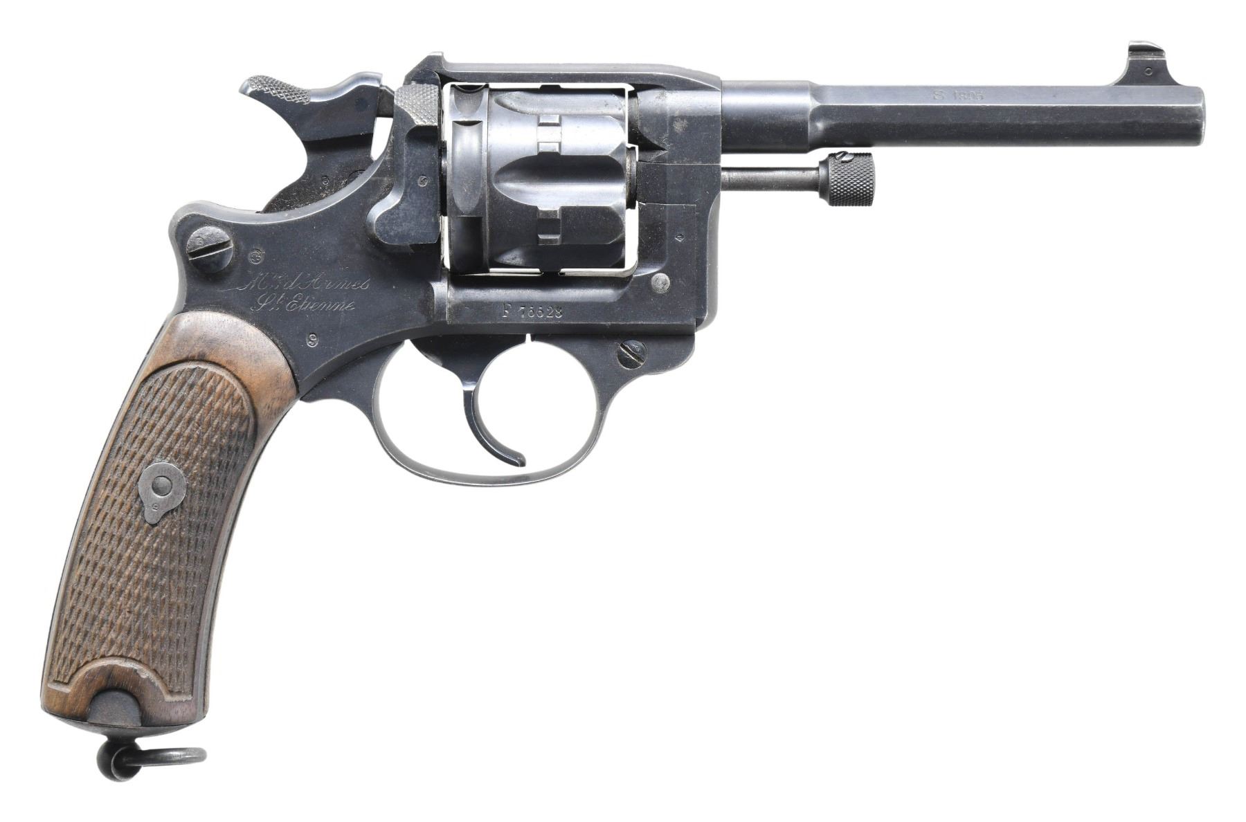 ACTION REVOLVER. Cal. 8x27mmR. S# F76628. Bbl. 4 5/8". Mle 1892 double action revolver mfg. by St. Etienne in 1895. Right side of the frame is marked "Mre d' Armes/ St. Etienne". Top flat of the bbl. is marked "Mle 1892", with "S 1895" marked on the right, and encircled "M" and "B" inspector proofs on the left. Metal components exhibit what appears to be an arsenal reapplied blue finish overall. Frame is mounted with 2-piece checkered wood grips and features a lanyard swivel and ring on the butt. Pinned blade front sight with integral U-notch rear sight. CONDITION: metal components retain the majority of their arsenal reapplied blue finish, showing some spots of light to mild wear fading to gray patina (primarily on edges), with light surface oxidation and pitting present overall. Relatively bright bore, exhibiting scattered patches of dark mild pitting, while retaining well defined rifling throughout. Proper manual mechanics in SA and DA. Grips show some smoothing to the diamonds and some scattered marks from handling and storage, but otherwise remain sound. (01-27388/MLW). ANTIQUE. $300-500.