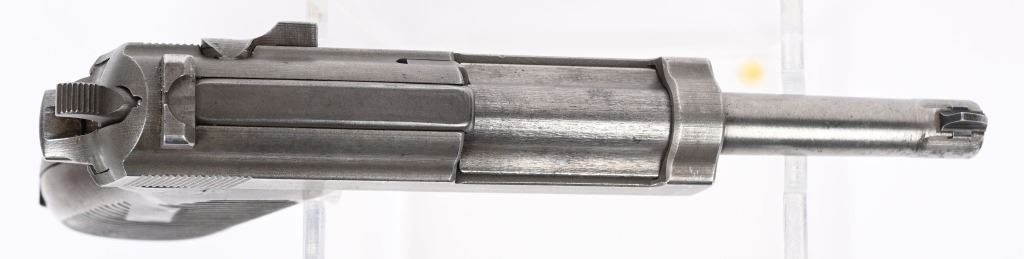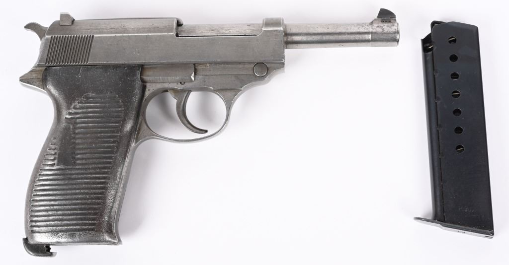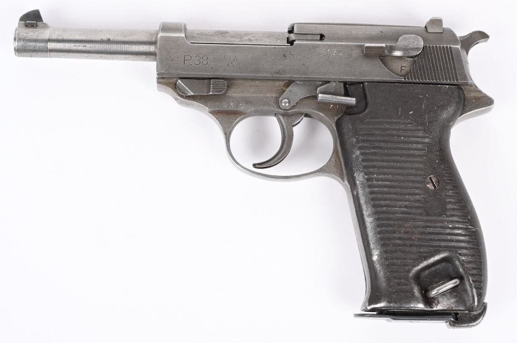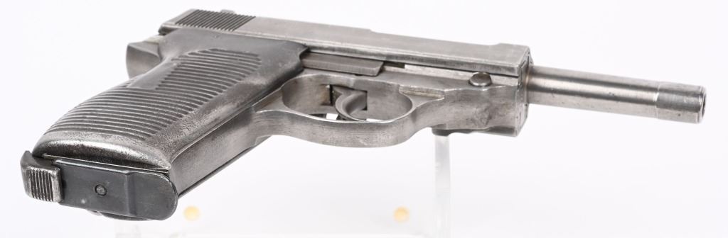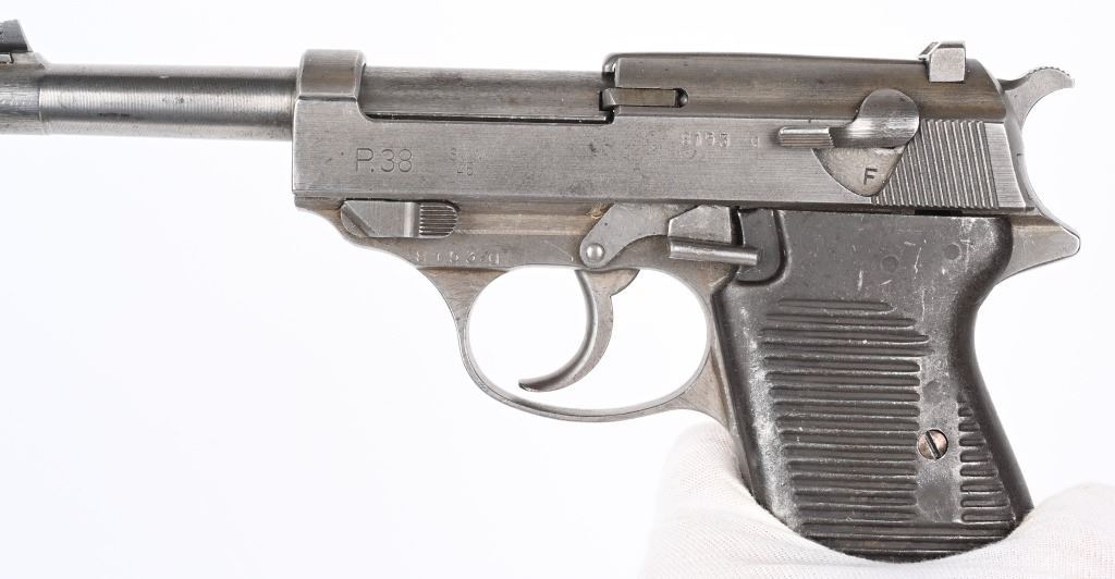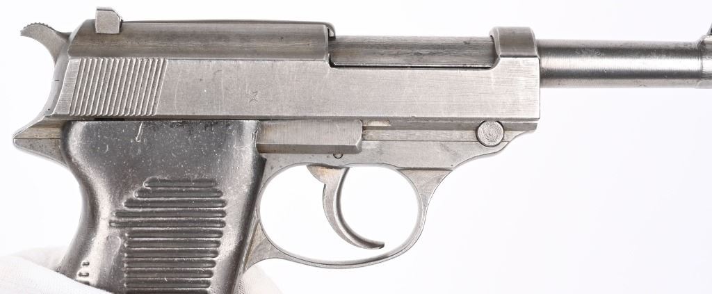 SERIAL NUMBER 8153g BARREL 4 7/8" CALIBER 9MM PAR, MANUFACTURED 1945. Known as the Grey Ghost by collectors. The SVW series of P-38 pistols were produced in France using tooling from Mauser in Germany. Finished in a very light colored parkerized finish with ribbed sheet metal 2 piece grips. The very first examples were produced under German occupation and have German proofs and military acceptance markings, Matching numbers including locking block . Barrel is WaA135 German inspected. CONDITION. Very fine with excellent bore and proper operating action. NON IMPORT C&R