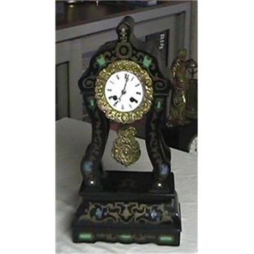 FABULOUS ORIGINAL LOUIS PHILIPPE STYLE FRENCH WOODEN SHELF CLOCK WITH SEMPRECIOUS STONES INLAYS. IT COMES WITH ITS OWN PENDULUM AND KEY. IT WORKS VERY WELL.