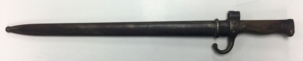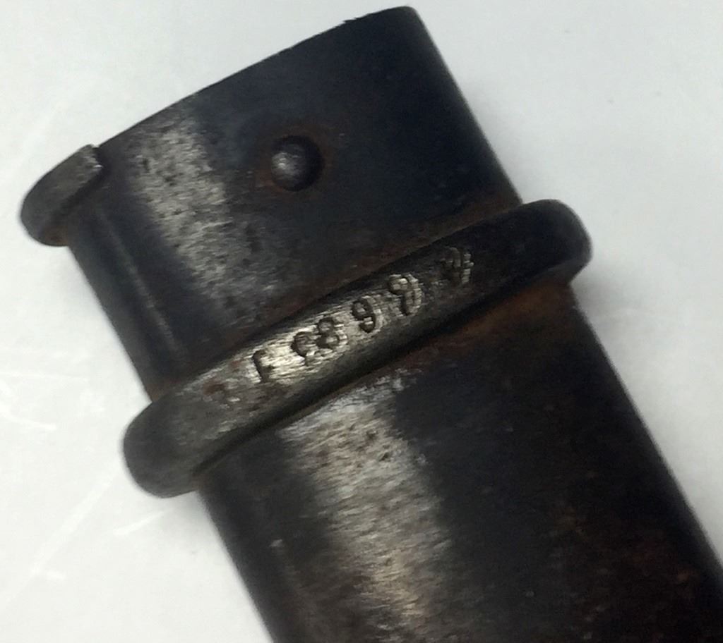 1892/17, AND 1916. THIS IS THE MODEL 1892 FIRST PRODUCTION MODEL, BUT FITTED WITH THE SECOND PATTERN MUZZLE RING. OVERALL LENGTH 514MM (20.236 INCHES). ALL STEEL SCABBARD WITH UNIT MARKINGS "AG 683 18"