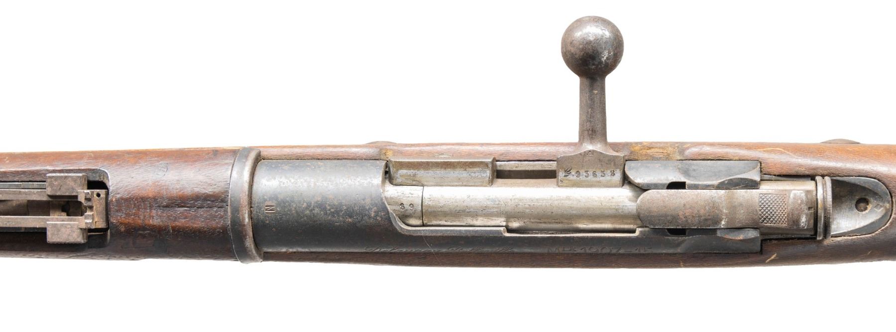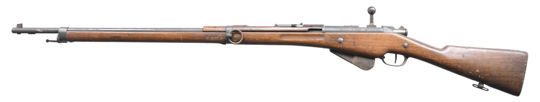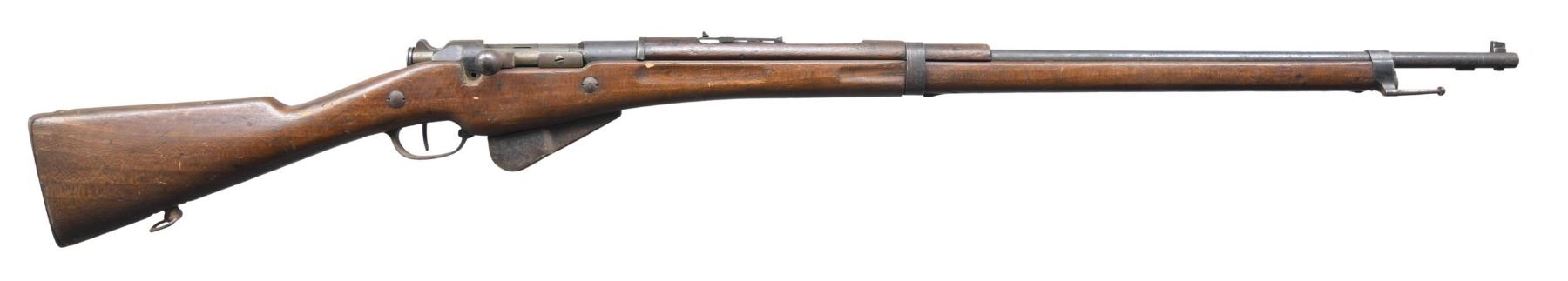 BERTHIER BOLT ACTION MILITARY RIFLE. Cal. 8MM Lebel. S# 23220; the serial # matches on the bbl. and buttstock. Bbl. 31 1/2". Receiver is marked on the left side, in script, "Delaunay Belleville" and "MLE 1907-15". Ladder rear sight, graduated to 2400 meters. Grooved front sight. Straight bolt handle. Take-down screw is missing from the right side of the bridge. Mag. holds 5 rds. Hardwood stock set. The forend is " Duffle Cut" under the lower barrel band. The partly visible roundel on the right side of the butt is dated "1911" and has "EDB" in the center. CONDITION: stock set has moderate wear and handling marks. Metal has turned gray with patina, showing spots of oxidation throughout. Bore is dark but shows strong lands. (25-2098/RW) CURIO. $100-200.