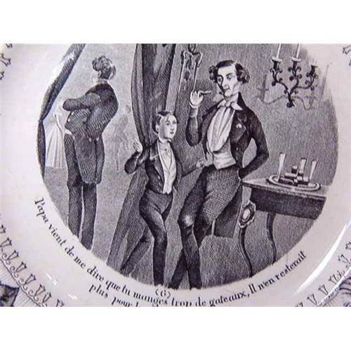 THIS IS A BLACK PORCELAIN OPAQUE TRANSFER PLATE WITH A "MEN IN A RESTAURANT" MADE BETWEEN 1844 AND 1849 IN FRANCE BY "CREIL et MONTERREAU" OR "MEDAILLES". I AM NOT FOR SURE IT IS FRENCH. I WISH SOMEONE OUT THERE WOULD TELL ME PLEASE. The Plate is in excellent condition for its age. It does not have any chips,cracks or repairs. It does of course have crazing on it. You can see most of this from my pictures. I HAVE OVER 800 POSITIVE FEEDBACKS FOR MY EBAY STORE. Thanks for Looking!!!