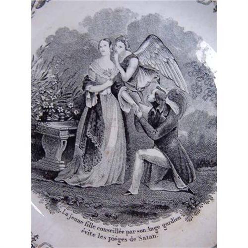 THIS IS A BLACK PORCELAIN OPAQUE TRANSFER PLATE WITH A "GUARDING ANGEL FROM SATAN" MADE BETWEEN 1834 AND 1839 IN FRANCE BY "CREIL et MONTERREAU" OR "MEDAILLES". I AM NOT FOR SURE IT IS FRENCH. I WISH SOMEONE OUT THERE WOULD TELL ME PLEASE. The Plate is in excellent condition for its age. It does not have any chips,cracks or repairs. It does of course have crazing on it. You can see most of this from my pictures. I HAVE OVER 800 POSITIVE FEEDBACKS FOR MY EBAY STORE. Thanks for Looking!!!