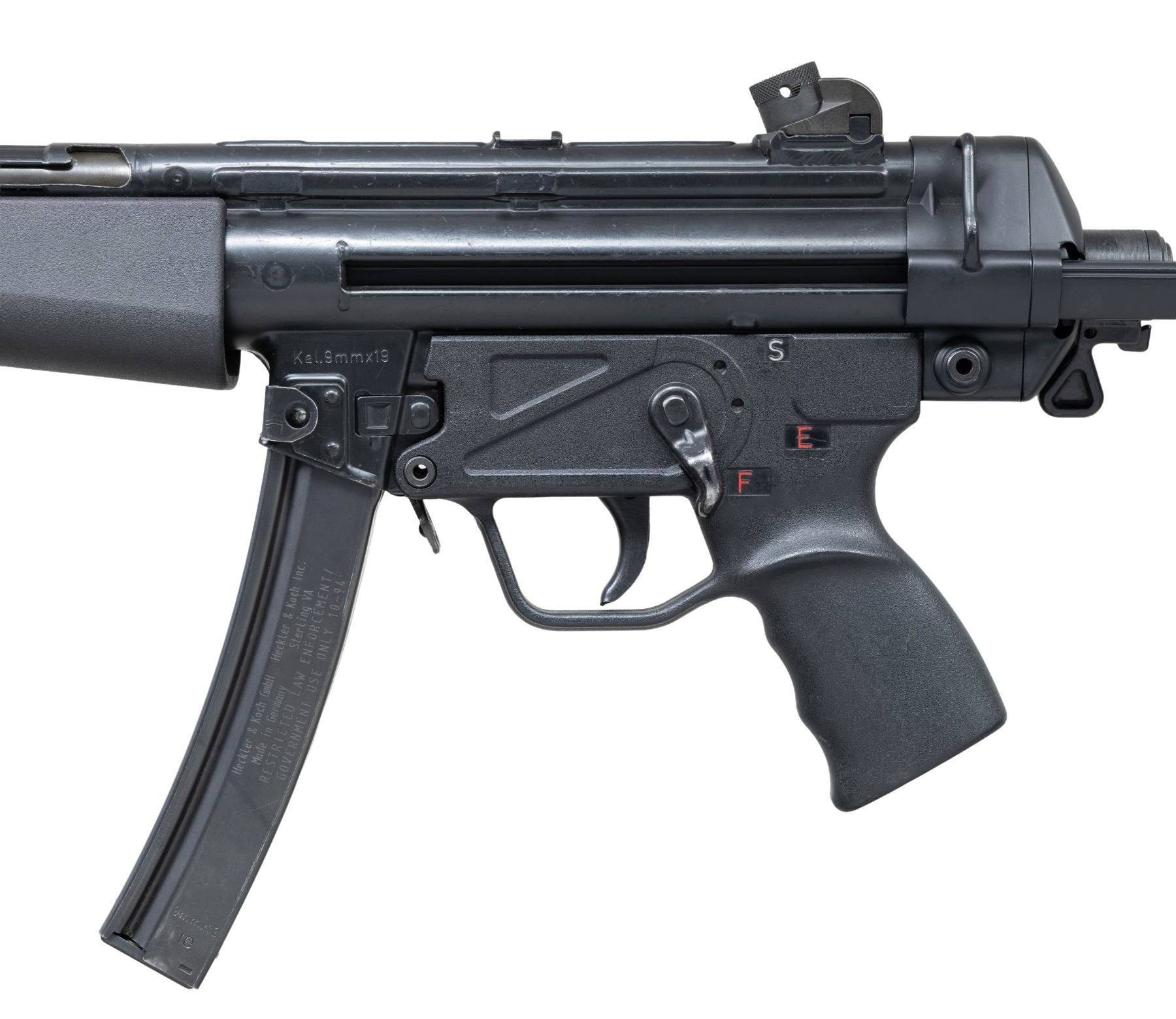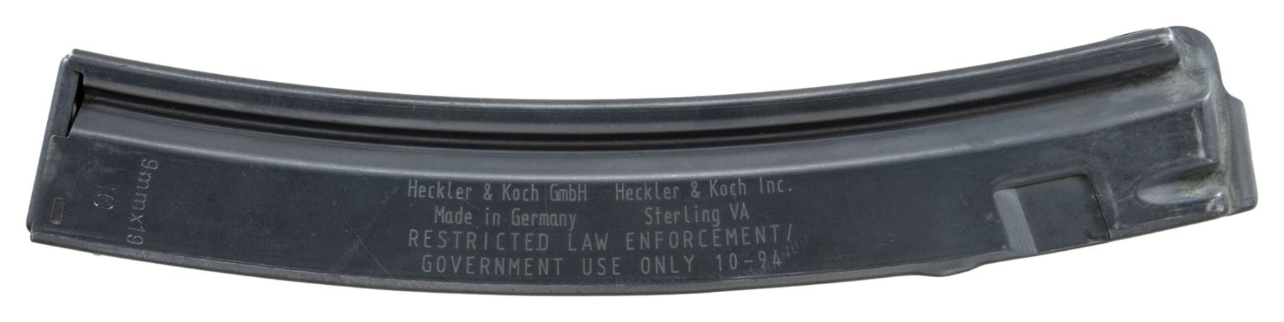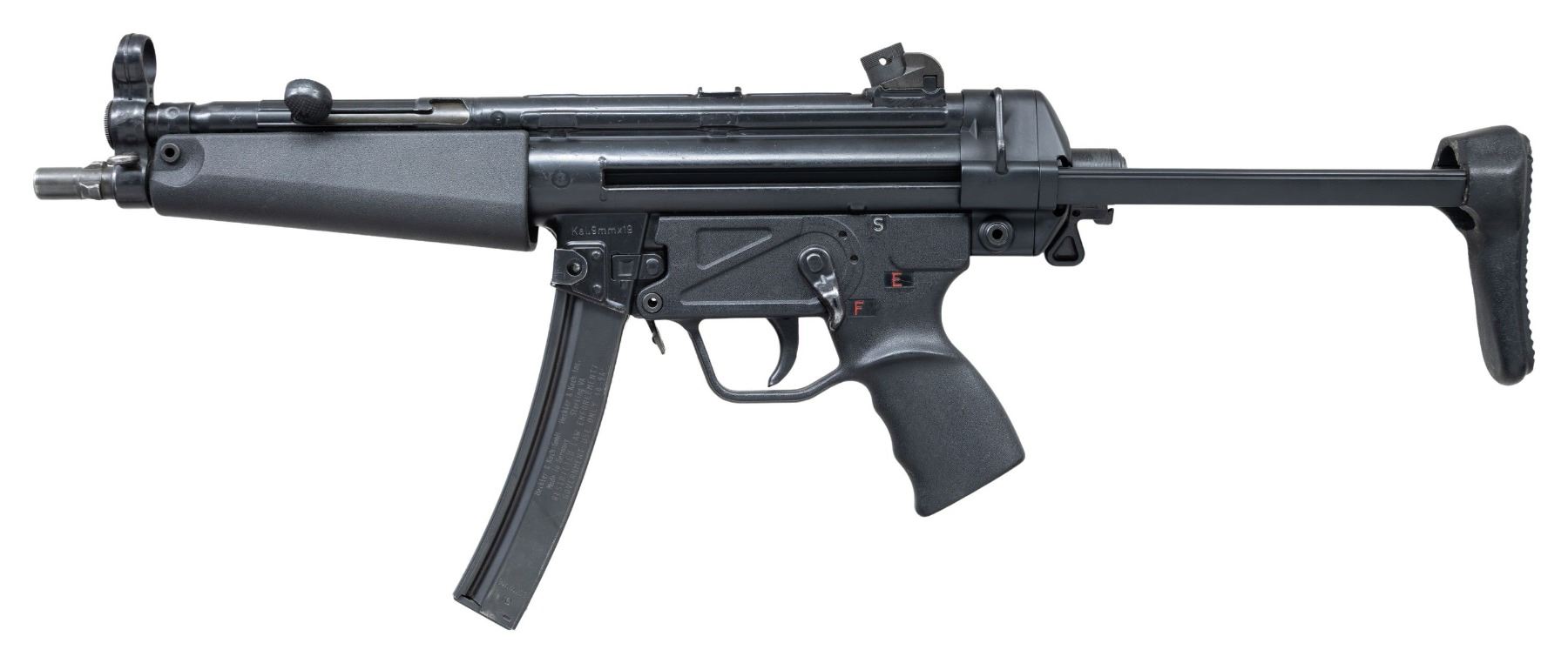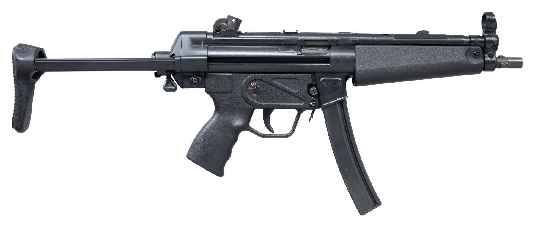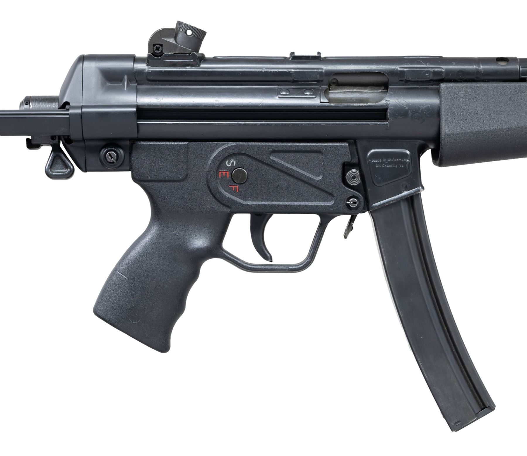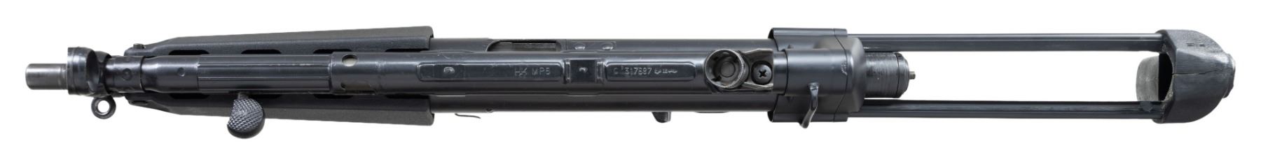 FULLY TRANSFERABLE, FACTORY GERMAN HK MP5A SMG. Cal. 9mm Parabellum. S# C317687. Bbl 10". Another Unicorn on the market. An iconic example of a very early, correct, original German MP5 SMG. A true German push-pin, swing-down receiver is an incredibly rare find as a fully transferable example. Top strap marked "HK MP5 / C317687" & Eagle over "N" signifying the federal insignia of Germany & suitable for use with smokeless powder, code "IE" indicating 1984 manufacture & "Antler" mark indicating ULM proof house. Left side mag.-well markings include "Kal 9mm x19". Right side of magazine well is marked "Made in Germany / HK Chantilly VA" where it was imported through. Front sight is a standard HK hooded post. Rear sight is the factory four position drum style peep sight. Site radius is approx. 13 1/4". Matte black painted finish. Paddle mag. release. A3, collapsible buttstock. Plastic, "SEF" swing-down trigger pack. 3-Lug barrel. MAGS: 1 factory 30 rd marked "Restricted Law Enforcement / Government Use Only 10-94". CONDITION: Finish on metal surfaces is complete and consistent with some light thinning on high edges, such as where a scope mount locks onto the receiver & in areas of mechanical intervention. This firearm is in very nice condition and is an excellent example of a very early iconic, original SMG that's passed the test of time & still wildly popular today. NATIONAL FIREARMS ACT MG REQUIRING BATF TRANSFER BEFORE TAKING POSSESSION. FULLY TRANSFERABLE. (03-1906/JZ). MODERN. CLASS III. $50,000-70,000.