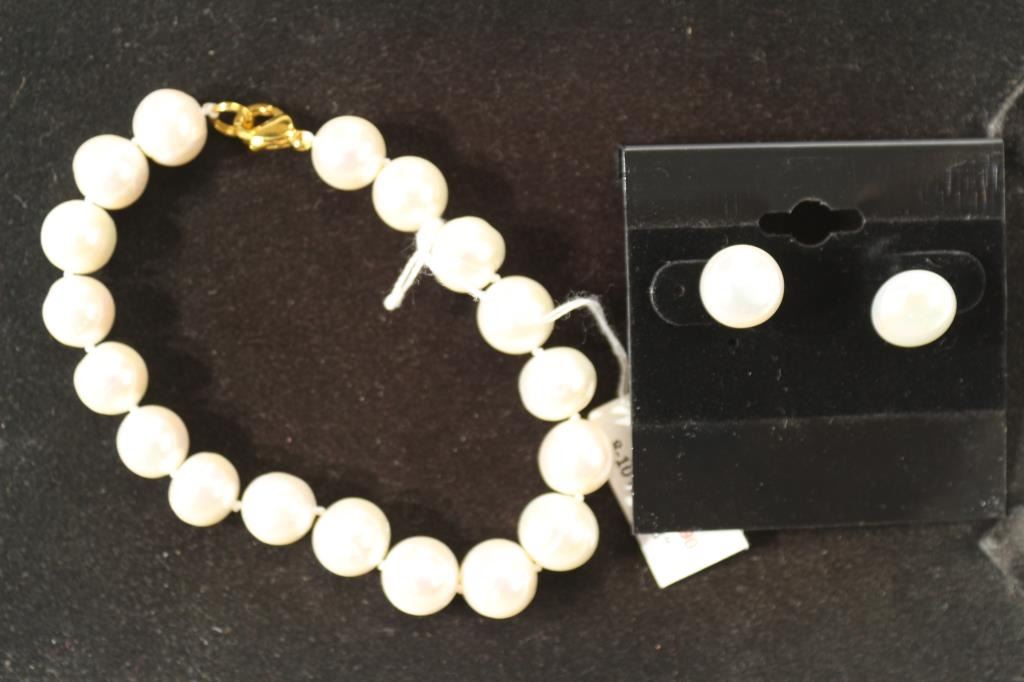 BRACELET IS 8"-8-10 MM PEARLS AND 10-11 MM POST EARRINGS, RETAIL IS $180.00, WHITE IN COLOR