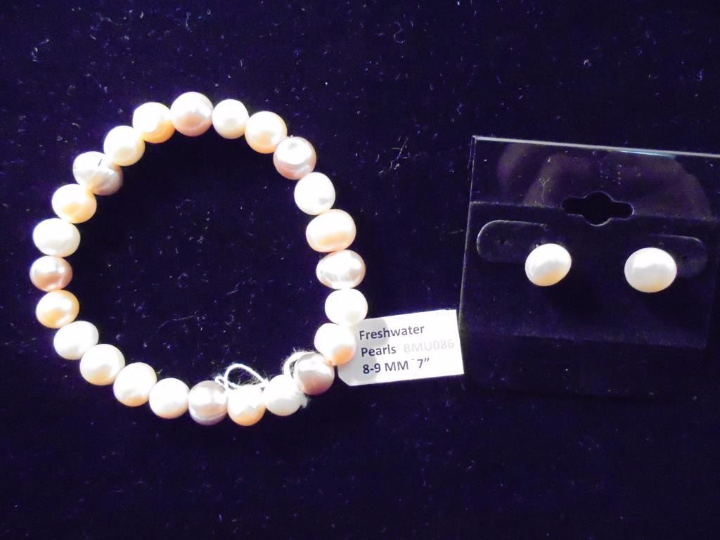 BRACELET IS 7" 8-9MM AND STUD EARRINGS ARE  8-9MM, RETAILS FOR $110.00. PINK IN COLOR.