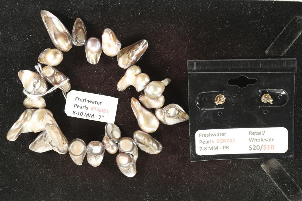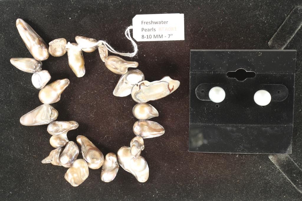 BRACELET IS (8-10MM IRREGULAR PEARLS) AND THE POST EARRINGS ARE (7-8MM ROUND PEARLS), BOTH ARE GREYISH/ BLUE/ SILVER IN COLOR, RETAILS FOR $50.00