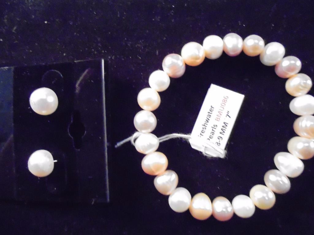BRACELET IS 7", 8-9MM AND EARRINGS ARE 9-10MM. RETAIL IS $130.00, WHITE/LIGHT PINK IN COLOR